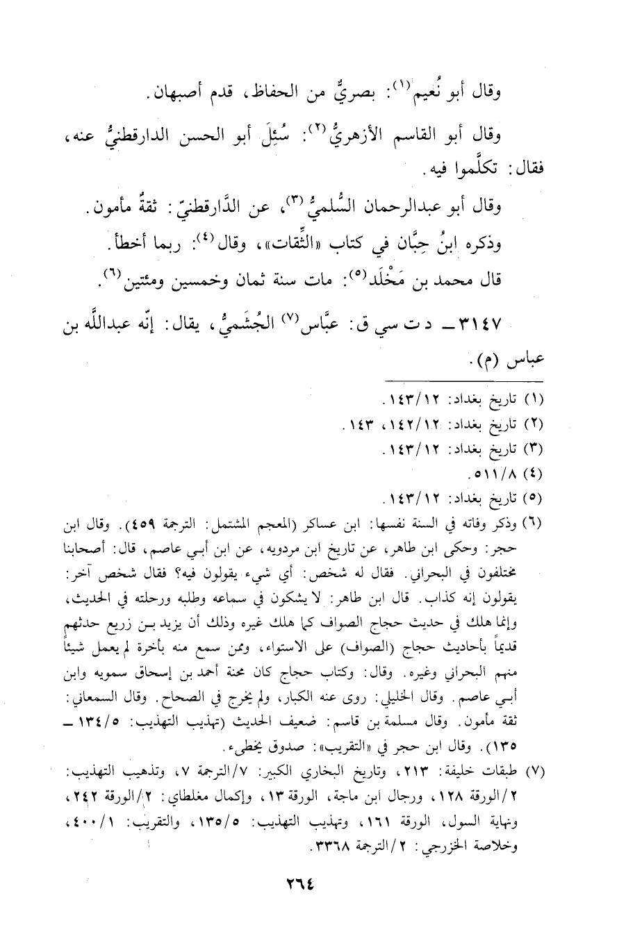 (6) وذكر وفاته في السنة نفسها: ابن عساكر (المعجم المشتمل: الترجمة 459) . وَقَال ابن حجر: وحكى ابن طاهر، عن تاريخ ابن مردويه، عن ابن أَبي عاصم، قال: أصحابنا مختلفون في البحراني. فقال له شخص: أي شيء يقولون فيه؟ فقال شخص آخر: يقولون إنه كذاب. قال ابن طاهر: لا يشكون في سماعه وطلبه ورحلته في الحديث، وإنما هلك في حديث حجاج الصواف كما هلك غيره وذلك أن يزيد بن زريع حدثهم قديما بأحاديث حجاج (الصواف) على الاستواء، وممن سمع منع بأخرة لم يعمل شيئا منهم البحراني وغيره. وَقَال: وكتاب حجاج كان محنة أحمد بن إسحاق سمويه وابن أَبي عاصم. وَقَال الخليلي: روب عنه الكبار، ولم يخرج في الصحاح. وَقَال السمعاني: ثقة مأمون. وَقَال مسلمة بن قاسم: ضعيف الحديث (تهذيب التهذيب: 5 / 134 - 135) . وَقَال ابن حجر في "التقريب": صدوق يخطئ.