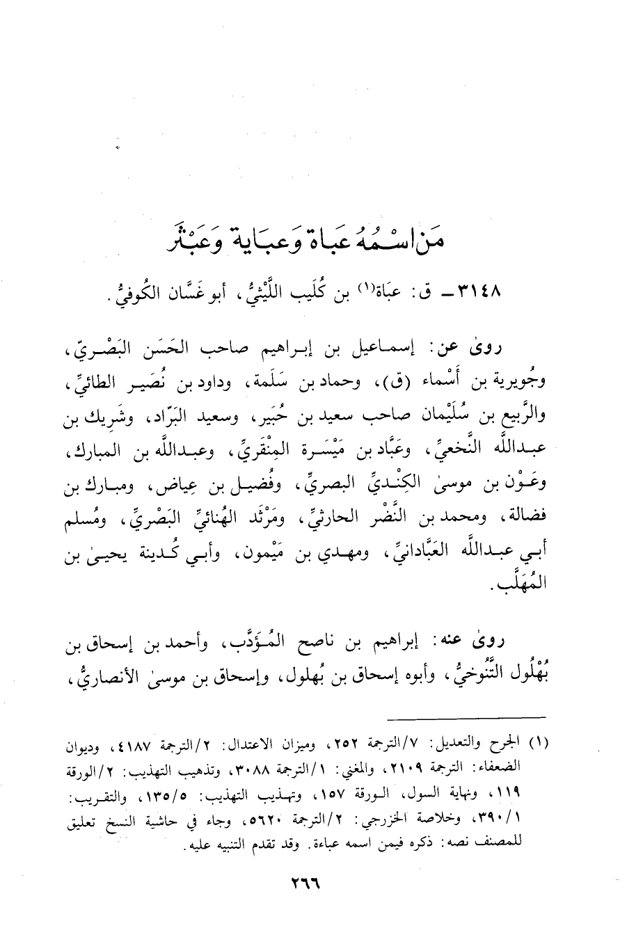 (1) الجرح والتعديل: 7 / الترجمة 252، وميزان الاعتدال: 2 / الترجمة 4187، وديوان الضعفاء: الترجمة 2109، والمغني: 1 / الترجمة 3088، وتذهيب التهذيب: 2 / الورقة 119، ونهاية السول، الورقة 157، وتهذيب التهذيب: 5 / 135، والتقريب: 1 / 390، وخلاصة الخزرجي: 2 / الترجمة 5620، وجاء في حاشية النسخ تعليق للمصنف نصه: ذكره فيمن اسمه عباءة. وقد تقدم التنبيه عليه.