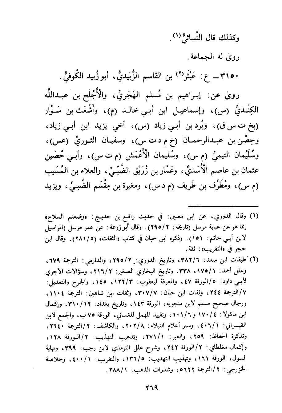 (2) طبقات ابن سعد: 6 / 382، وتاريخ الدوري: 2 / 295، والدارمي: الترجمة 679، وعلل أحمد: 1 / 175، 338، وتاريخ البخاري الصغير: 2 / 216، وسؤالات الآجري لابي داود: 5 / الورقة 47، والمعرفة ليعقوب: 3 / 122، 145، والجرح والتعديل: 7 / الترجمة 244، وثقات ابن حبان: 7 / 307، وثقات ابن شاهين: الترجمة 1104، ورجال صحيح مسلم لابن منجويه، الورقة 143، وتاريخ بغداد: 12 / 310، وإكمال ابن ماكولا: 4 / 170 و6 / 101، وتقييد المهمل للغساني، الورقة 75 ب، والجمع لابن القيسراني: 1 / 406، وسير أعلام النبلاء: 8 / 202، والكاشف: 2 / الترجمة 2640، وتذكرة الحفاظ: 259، والعبر: 1 / 271، وتذهيب التهذيب: 2 / الورقة 128، وإكمال مغلطاي: 2 / الورقة 242، وشرح علل التِّرْمِذِيّ لابن رجب: 399، ونهاية السول، الورقة 161، وتهذيب التهذيب: 5 / 136، والتقريب:: 1 / 400، وخلاصة الخزرجي: 2 / الترجمة 5622، وشذرات الذهب: 1 / 288.