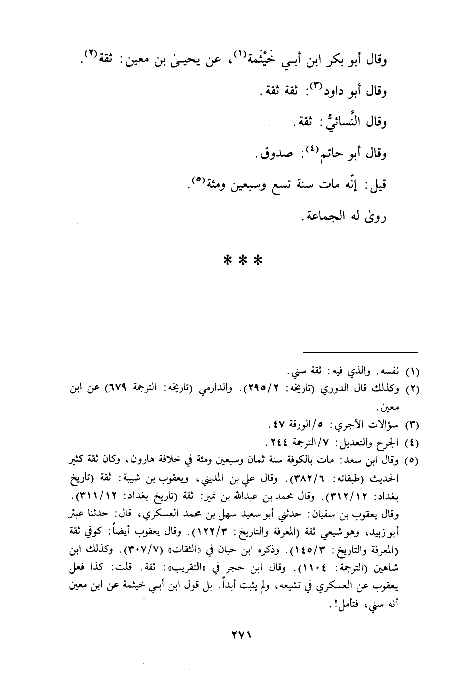 (5) وَقَال ابن سعد: مات بالكوفة سنة ثمان وسبعين ومئة في خلافة هارون، وكان ثقة كثير الحديث (طبقاته: 6 / 382) . وَقَال علي بن المديني، ويعقوب بن شَيْبَة: ثقة (تاريخ بغداد: 12 / 312) . وَقَال محمد بن عَبد الله بن نمير: ثقة (تاريخ بغداد: 12 / 311) . وَقَال يعقوب بن سفيان: حدثني أبو سَعِيد سهل بن محمد العسكري، قال: حَدَّثَنَا عبثر أبو زبيد، وهو شيعي ثقة (المعرفة والتاريخ: 3 / 122) . وَقَال يعقوب أيضا: كوفي ثقة (المعرفة والتاريخ: 3 / 145) ، وذَكَره ابنُ حِبَّان في "الثقات" (7 / 307) . وكذلك ابن شاهين (الترجمة: 1104) . وَقَال ابن حجر في "التقريب": ثقة. قلت: كذا فعل يعقوب عن العسكري في تشعيه، ولم يثبت أبدا. بل قول ابن أَبي خيثمة عن ابن مَعِين أنه سني، فتأمل!.
