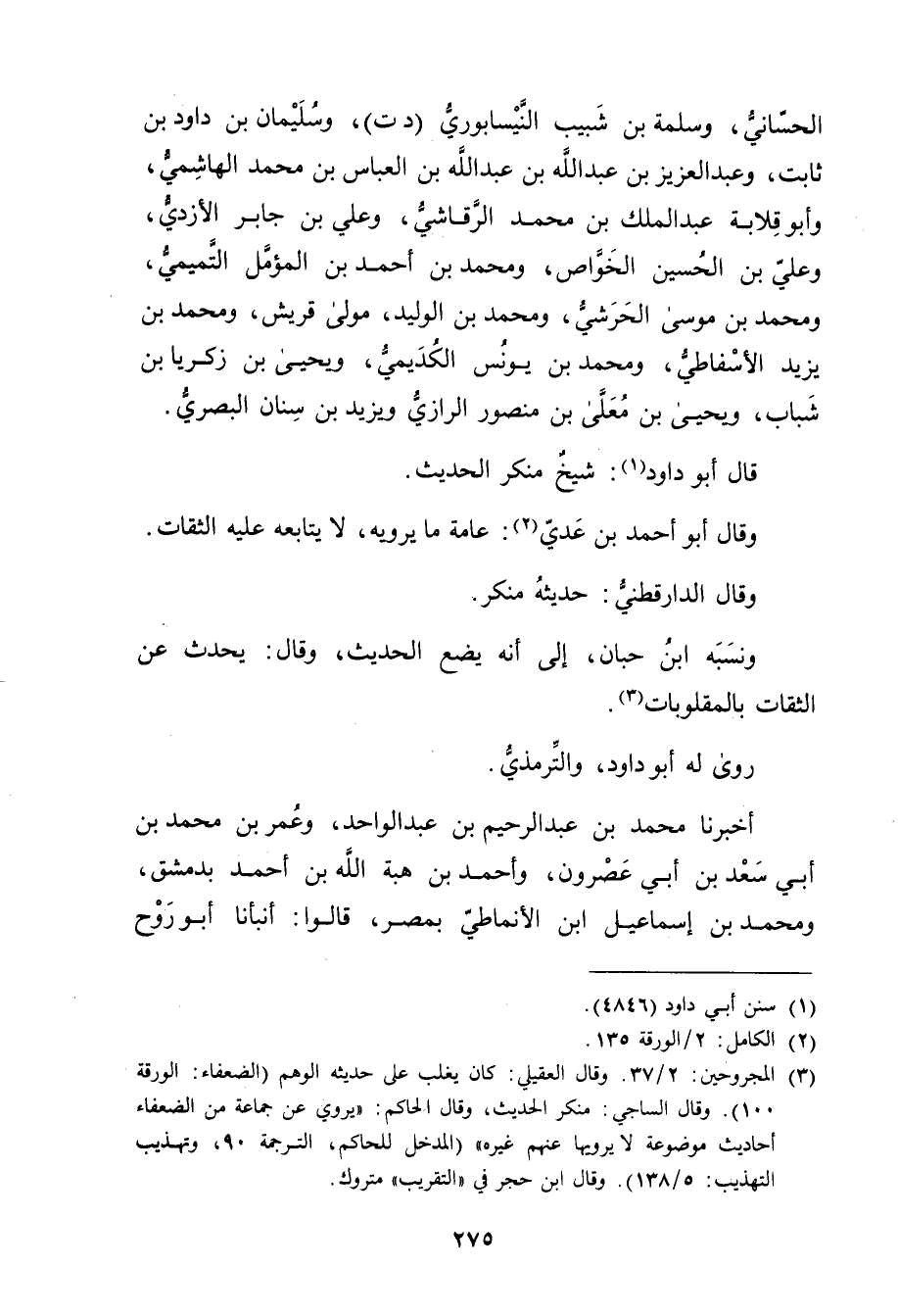 (3) المجروحين: 2 / 37. وَقَال العقيلي: كان يغلب على حديثه الوهم (الضعفاء: الورقة 100) . وَقَال الساجي: منكر الحديث، وَقَال الحاكم: يروي عن جماعة من الضعفاء أحاديث موضوعة لا يرويها عنهم غيره" (المدخل للحاكم، الترجمة 90، وتهذيب التهذيب: 5 / 138) . وَقَال ابن حجر في "التقريب"متروك.