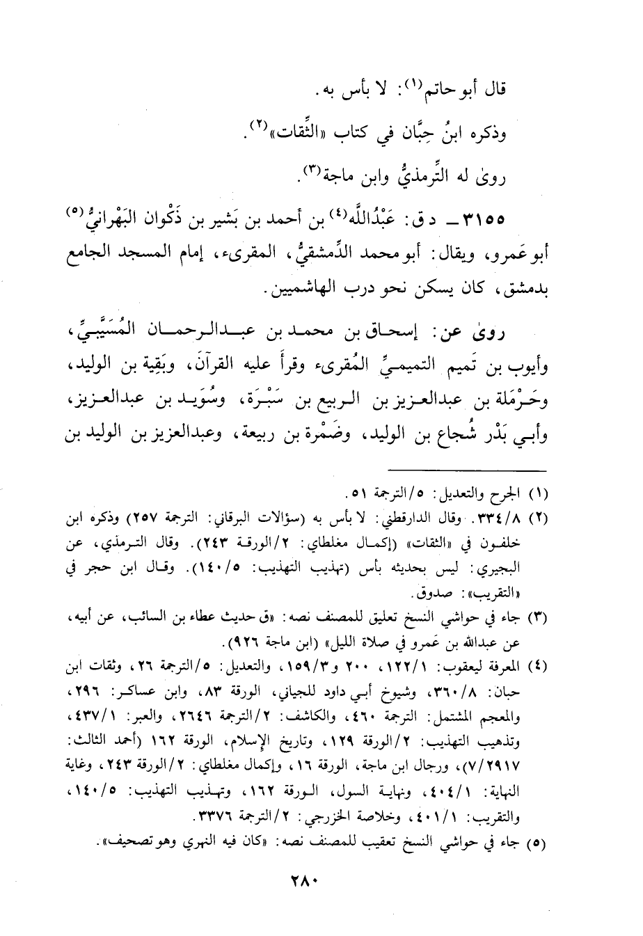 (4) المعرفة ليعقوب: 1 / 122، 200 و3 / 159، والتعديل: 5 / الترجمة 26، وثقات ابن حبان: 8 / 360، وشيوخ أبي داود للجياني، الورقة 83، وابن عساكر: 296، والمعجم المشتمل: الترجمة 460، والكاشف: 2 / الترجمة 2646، والعبر: 1 / 437، وتذهيب التهذيب: 2 / الورقة 129، وتاريخ الاسلام، الورقة 162 (أحمد الثالث: 2917 / 7) ، ورجال ابن ماجة، الورقة 16، وإكمال مغلطاي: 2 / الورقة 243، وغاية النهاية: 1 / 404، ونهاية السول، الورقة 162، وتهذيب التهذيب: 5 / 140، والتقريب: 1 / 401، وخلاصة الخزرجي: 2 / الترجمة 3376.