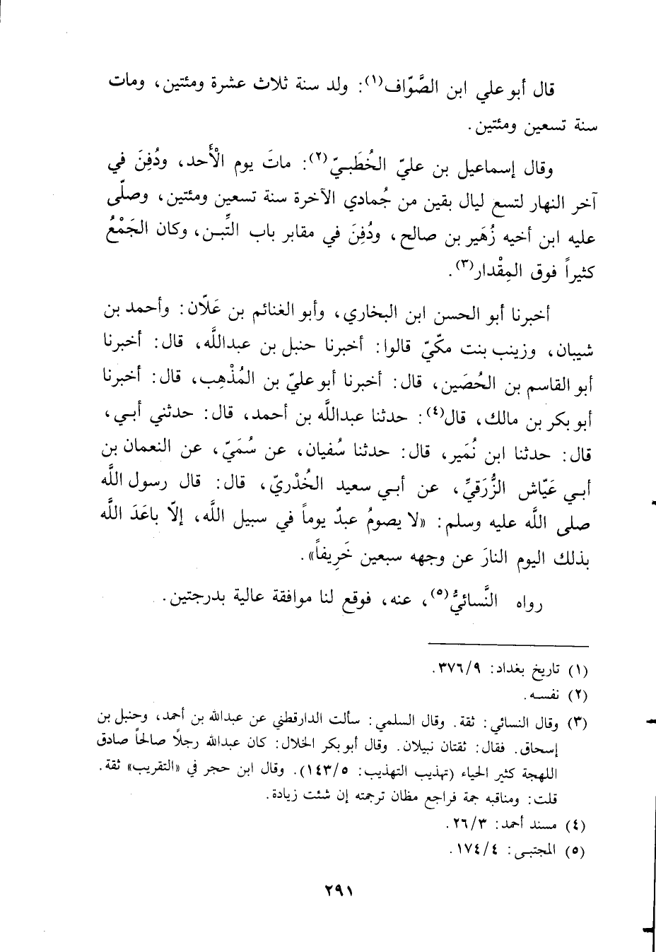 أَخْبَرَنَا أَبُو الْحَسَنِ بْنُ الْبُخَارِيِّ، وأَبُو الْغَنَائِمِ بْنُ عَلانَ: وأَحْمَدُ بْنُ شَيْبَانَ، وزَيْنَبُ بِنْتُ مَكِّيٍّ قَالُوا: أخبرنا حَنْبَلُ بْن عَبد الله، قال: أَخْبَرَنَا أبو القاسم بْن الحصين، قال: أَخْبَرَنَا أبو علي بْن المذهب، قال: أَخْبَرَنَا أبو بكر بْن مالك، قال (4) : حَدَّثَنَا عَبد الله بْن أَحْمَدَ، قال: حَدَّثني أبي، قال: حَدَّثَنَا ابْنُ نُمَيْرٍ، قال: حَدَّثَنَا سُفْيَانُ، عَنْ سُمَيٍّ، عَنِ النعمان بن أبي عياش الزرقي، عَن أَبِي سَعِيد الخُدْرِيّ، قال: قال رَسُولُ اللَّهِ صلى الله عَلَيْهِ وسَلَّمَ: لا يَصُومُ عَبْدٌ يَوْمًا فِي سَبِيلِ اللَّهِ، إِلا بَاعَدَ اللَّهُ بِذَلِكَ الْيَوْمِ النَّارَ عَنْ وجْهِهِ سَبْعِينَ خَرِيفًا.