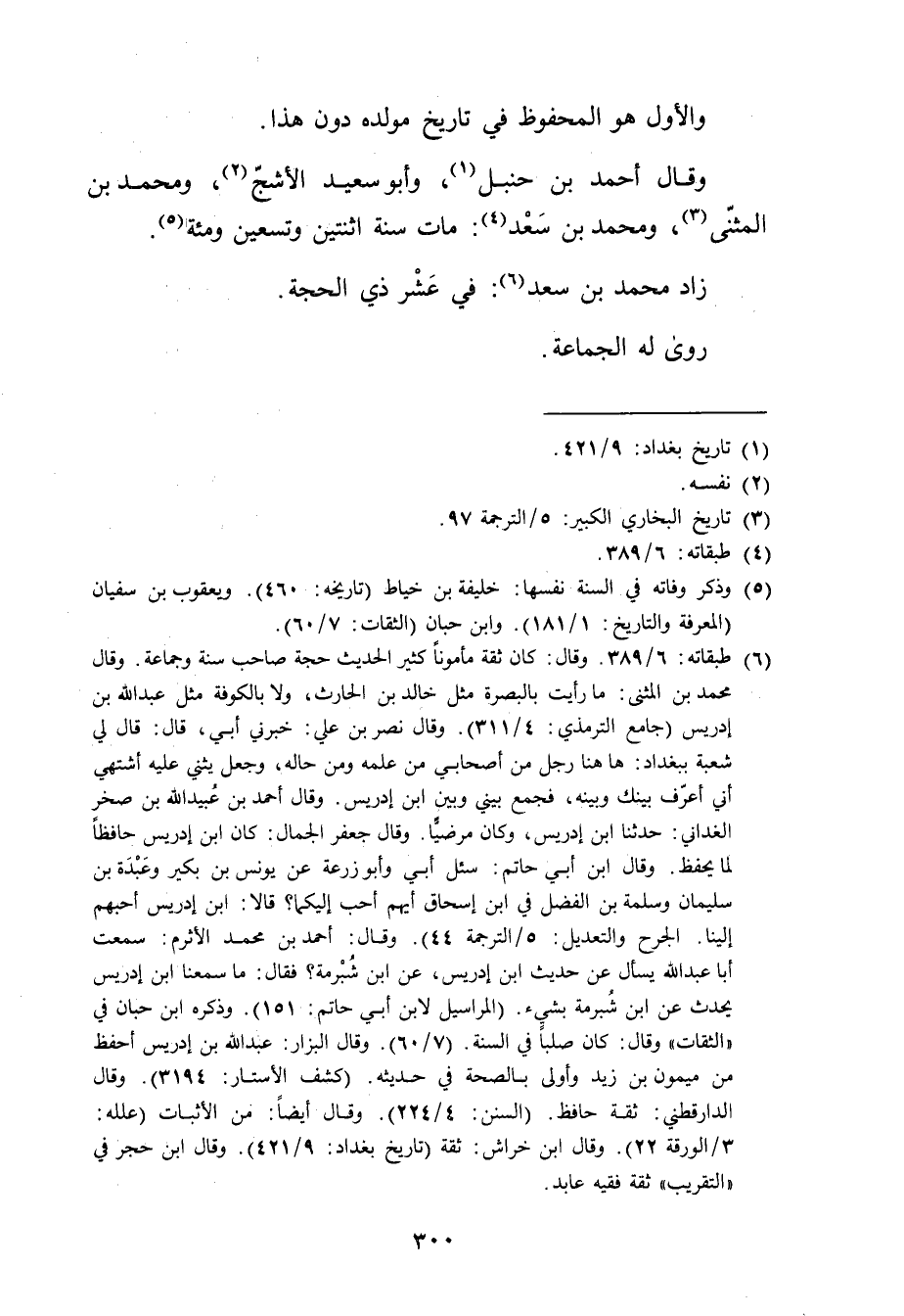 (6) طبقاته: 6 / 389. وَقَال: كان ثقة مأمونا كثير الحديث حجة صاحب سنة وجماعة. وَقَال محمد بن المثنى: ما رأيت بالبصرة مثل خالد بن الحارث، ولا بالكوفة مثل عَبد الله بن إدريس (جامع التِّرْمِذِيّ: 4 / 311) . وَقَال نصر بن علي: خبرني أبي، قال: قال لي شعبة ببغداد: هاهنا رجل من أصحابي من علمه ومن حاله، وجعل يثني عليه أشتهي أني أعرف بينك وبينه، فجمع بيني وبين ابن إدريس. وَقَال أحمد بن عُبَيد الله بن صخر الغداني: حَدَّثَنَا ابن إدريس، وكان مرضيا. وَقَال جعفر الجمال: كان ابن إدريس حافظا لما يحفظ. وَقَال ابن أَبي حاتم: سئل أبي وأبو زُرْعَة عن يونس بن بكير وعبدة بن سُلَيْمان وسلمة بن الفضل في ابن إسحاق أيهم أحب إليكما؟ قالا: ابن إدريس أحبهم إلينا. الجرح والتعديل: 5 / الترجمة 44) . وَقَال: أحمد بن محمد الأثرم: سمعت أبا عَبد الله يسأل عن حديث ابن إدريس، عن ابن شبرمة؟ فقال: ما سمعنا ابن إدريس يحدث عن ابن شبرمة بشيءٍ. (المراسيل لابن أَبي حاتم: 151) ، وذَكَره ابنُ حِبَّان في "الثقات" وَقَال: كان صلبا في السنة. (7 / 60) . وَقَال البزار: عَبد الله بن إدريس أحفظ من ميمون بن زيد وأولى بالصحة في حديثه. (كشف الاستار: 3194) . وَقَال الدَّارَقُطْنِيُّ: ثقة حافظ. (السنن: 4 / 224) .