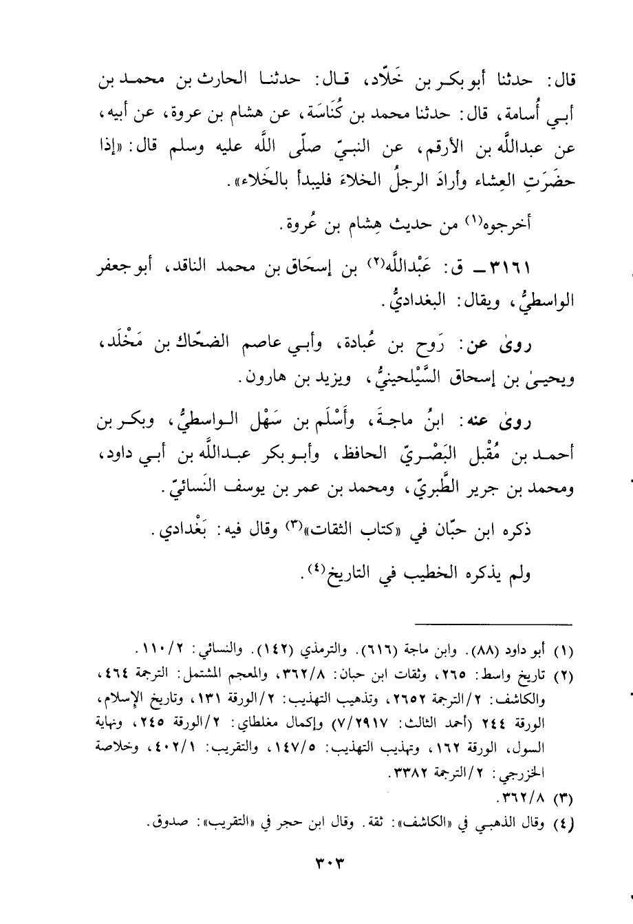 3161 - ق: عَبد اللَّهِ بن إِسْحَاق بن مُحَمَّد الناقد (2) ، أَبُو جَعْفَر الواسطي، ويُقال: البغدادي.