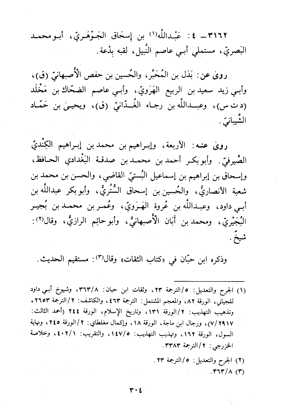 3162 - 4: عَبد اللَّهِ بن إِسْحَاق الْجَوْهَرِي (1) ، أَبُو مُحَمَّد البَصْرِيّ، مستملي أَبِي عَاصِم النبيل، لقبه بدعة.