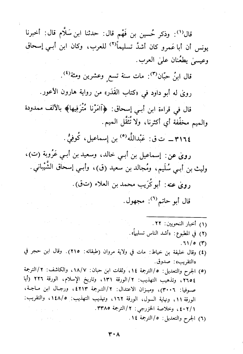 قال (1) : وذكر حسين بْن فَهُمْ قال: حَدَّثَنَا ابْن سلام قال: أَخْبَرَنَا يُونُس أَن أبا عَمْرو كَانَ أشد تسليما (2) للعرب، وكَانَ ابْن أَبي إِسْحَاق وعيسى يطعنان عَلَى العرب.