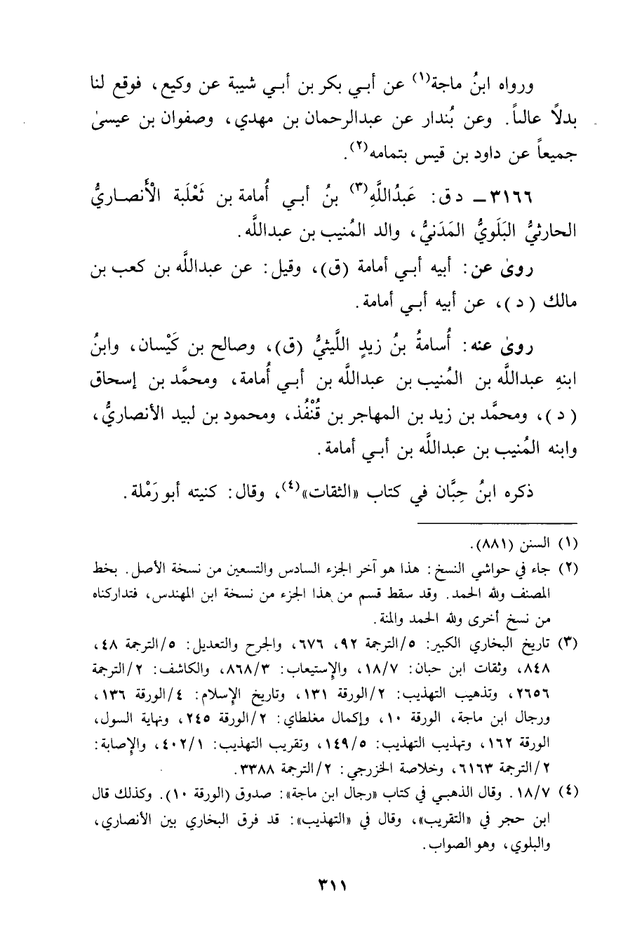 3166 - د ق: عَبد اللَّهِ بْن أَبي أمامة بْن ثعلبة الأَنْصارِيّ الحارثي البلوي المدني (3) ، والد المنيب بْن عَبد اللَّهِ.