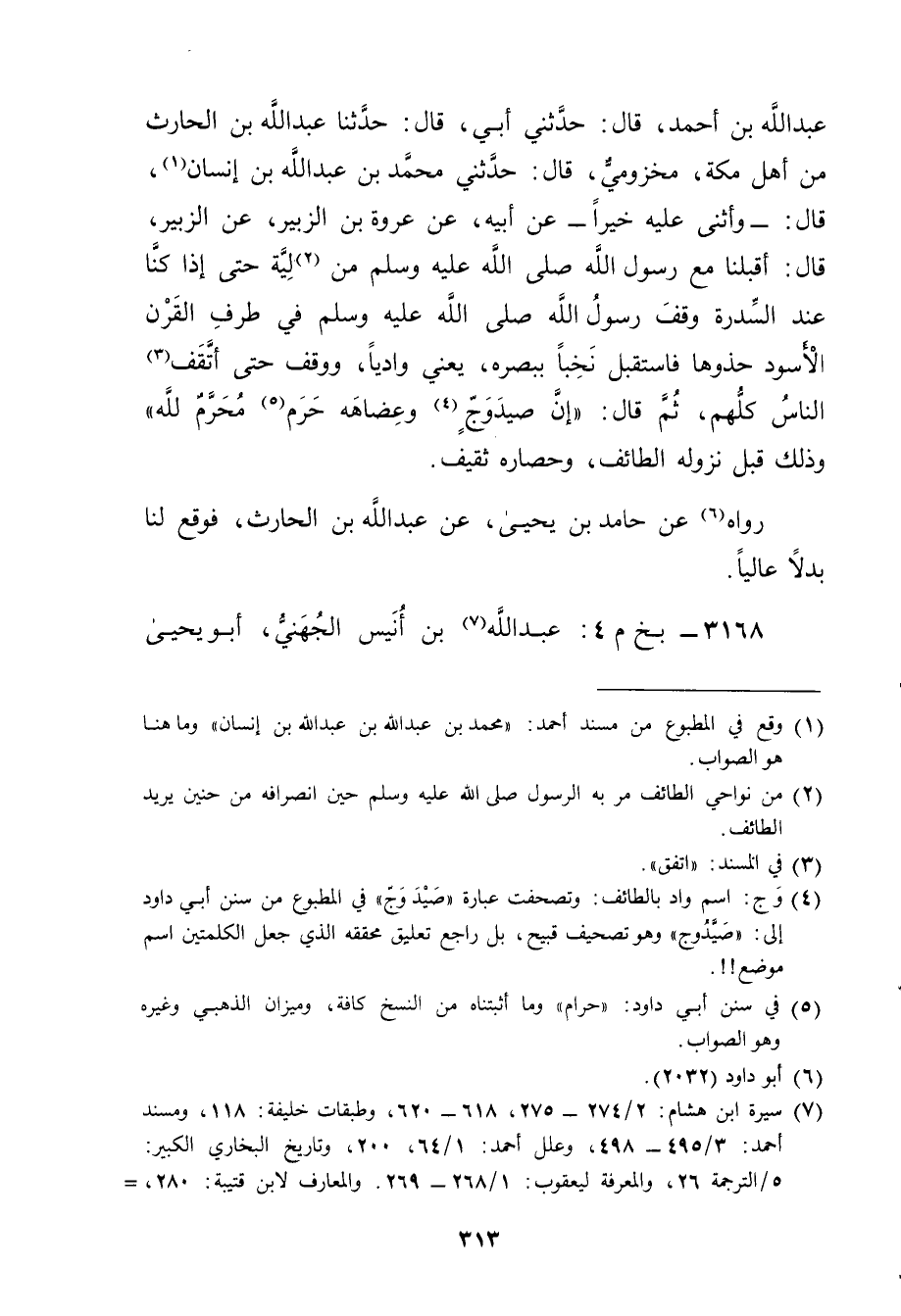 عَبد اللَّهِ بْن أَحْمَدَ، قال: حَدَّثني أَبِي، قال: حَدَّثَنَا عَبد اللَّهِ بْنُ الْحَارِثِ مِنْ أَهْلِ مَكَّةَ، مَخْزُومِيٌّ، قال: حَدَّثَنِي مُحَمَّدُ بْنُ عَبد اللَّهِ بْنِ إِنْسَانَ (1) ، قال: - وأَثْنَى عَلَيْهِ خَيْرًا - عَن أَبِيهِ، عَنْ عروة بْن الزبير، عَنِ الزُّبَيْرِ، قال: أَقْبَلَنَا مَعَ رَسُولِ اللَّهِ صلى الله عليه وسلم مِنْ (2) لِيَّةَ حَتَّى إِذَا كُنَّا عِنْدَ السِّدْرَةِ وقَفَ رَسُولُ اللَّهِ صلى الله عليه وسلم فِي طَرَفِ الْقَرَنِ الأَسْوَدِ حَذْوَهَا فَاسْتَقْبِلَ نَخْبًا بِبَصَرِهِ، يَعْنِي وادِيًا، ووَقَفَ حَتَّى أَتَّقَفَ (3) النَّاسُ كُلُّهُمْ، ثُمَّ قال: إن صيدوج (4) وعِضَاهَه حَرَمٌ (5) مُحَرَّمٌ لِلَّهِ"وذَلِكَ قَبْلَ نُزُولِهِ الطَّائِفَ، وحِصَارِهِ ثَقِيفَ.