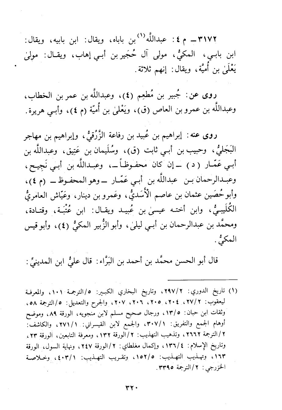 3172 - م 4: عَبد اللَّهِ بن باباه (1) ، ويُقال: ابْن بأبيه، ويُقال: ابْن بابي، الْمَكِّي، مولى آل حجير بْن أَبي إهاب، ويُقال: مولى يَعْلَى بْن أمية، ويُقال: إنهم ثلاثة.