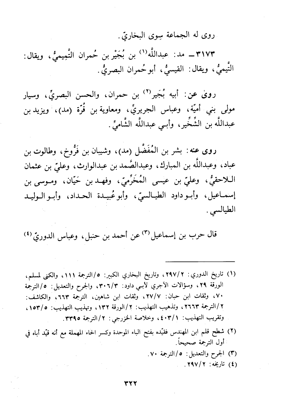 3173 - مد: عَبد اللَّهِ بن بجير بن حمران التميمي (1) ، ويُقال: التَّيْمِيّ، ويُقال: القيسي، أَبُو حمران البَصْرِيّ.