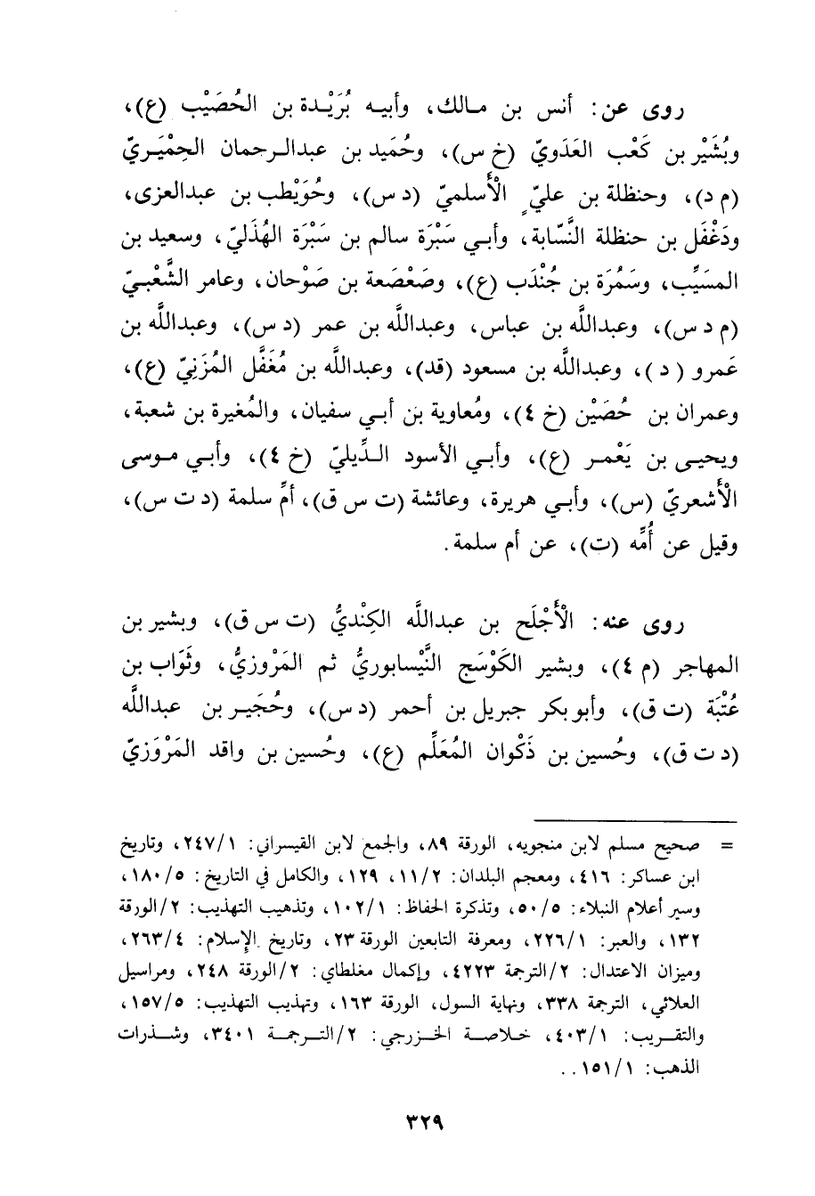 = صحيح مسلم لابن منجوية، الورقة 89، والجمع لابن القيسراني: 1 / 247، وتاريخ ابن عساكر: 416، ومعجم البلدان: 2 / 11، 129، والكامل في التاريخ: 5 / 180، وسير أعلام النبلاء: 5 / 50، وتذكرة الحفاظ: 1 / 102، وتذهيب التهذيب: 2 / الورقة 132، والعبر: 1 / 226، ومعرفة التابعين الورقة 23، وتاريخ الاسلام: 4 / 263، وميزان الاعتدال: 2 / الترجمة 4223، وإكمال مغلطاي: 2 / الورقة 248، ومراسيل العلائي، الترجمة 338، ونهاية السول، الورقة 163، وتهذيب التهذيب: 5 / 157، والتقريب: 1 / 403، خلاصة الخزرجي: 2 / الترجمة 3401، وشذرات الذهب: 1 / 151.