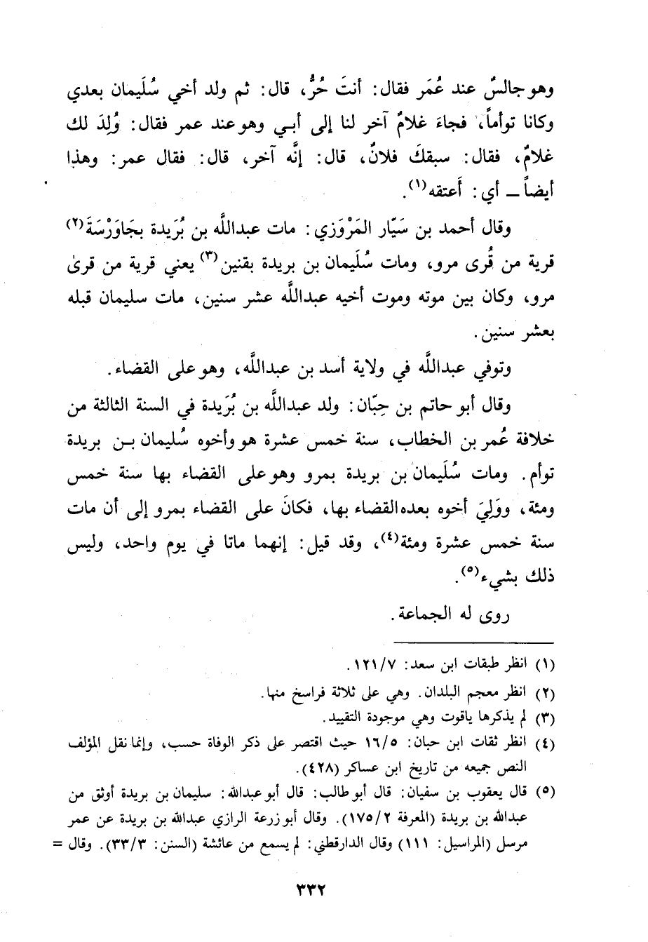 وَقَال أَبُو حاتم بْن حبان: ولد عَبد اللَّهِ بْن بريدة فِي السنة الثالثة من خلافة عُمَر بْن الْخَطَّاب، سنة خمس عشرة هُوَ وأخوه سُلَيْمان بن بريدة توأم. ومَاتَ سُلَيْمان بْن بريدة بمرو وهُوَ عَلَى الْقَضَاء بِهَا سنة خمس ومئة، وولي أخوه بعده الْقَضَاء بِهَا، فكان عَلَى الْقَضَاء بمرو إِلَى أَن مَاتَ سنة خمس عشرة ومئة (4) ، وقَدْ قيل: إنهما ماتا فِي يَوْم واحد، وليس ذَلِكَ بشيءٍ (5) .