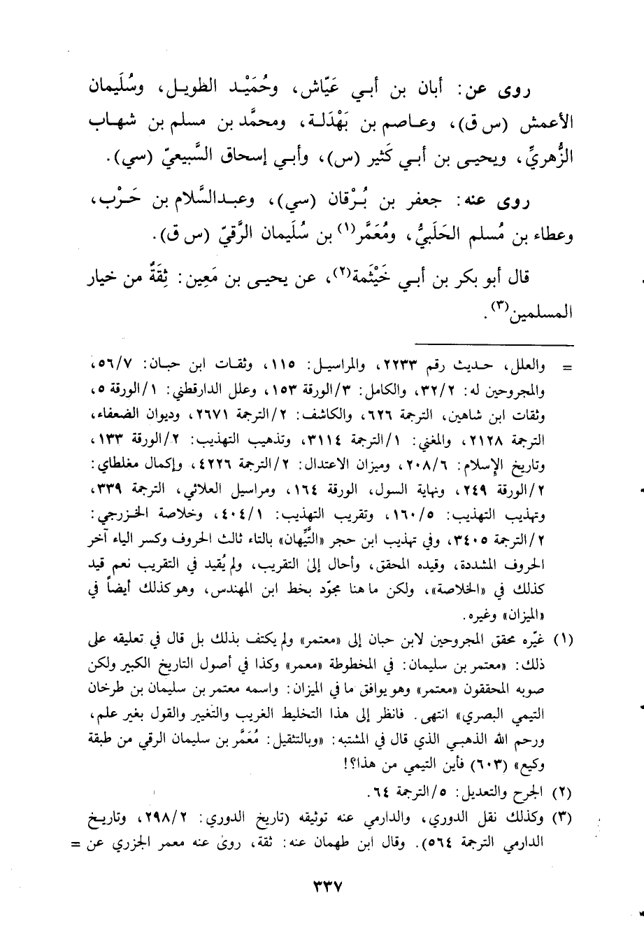 (1) غيره محقق المجروحين لابن حبان إلى"معتمر"ولم يكتف بذلك بل قال في تعليقه على ذلك: معتمر بن سُلَيْمان: في المخطوطة"معمر"وكذا في أصول التاريخ الكبير ولكن صوبه المحققون"معتمر"وهو يوافق ما في الميزان: واسمه معتمر بن سُلَيْمان بن طرخان التَّيْمِيّ البَصْرِيّ"انتهى.