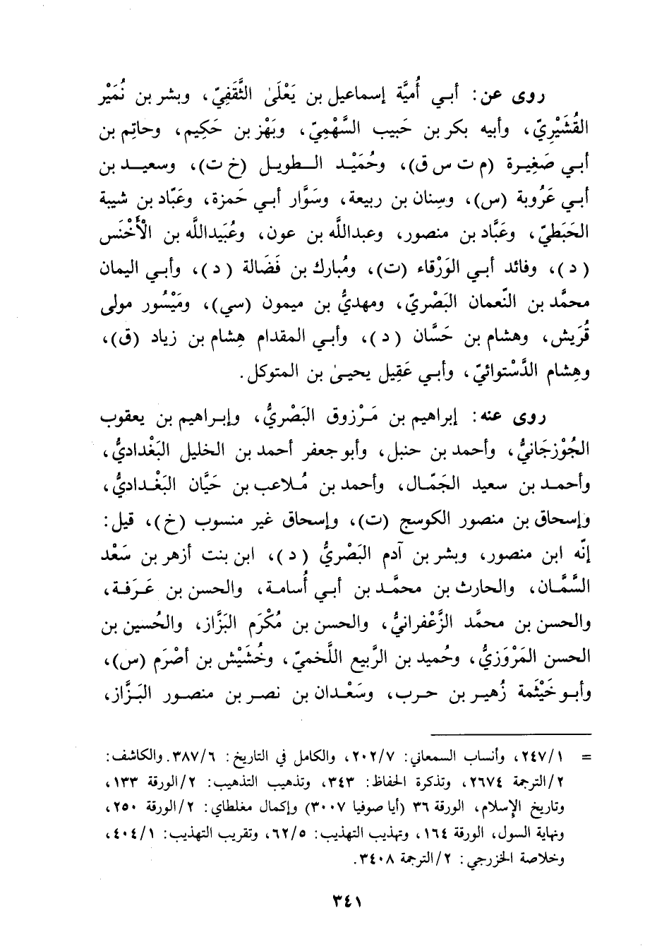 = 1 / 247، وأنساب السمعاني: 7 / 202، والكامل في التاريخ: 6 / 387. والكاشف: 2 / الترجمة 2674، وتذكرة الحفاظ: 343، وتذهيب التهذيب: 2 / الورقة 133، وتاريخ الاسلام، الورقة 36 (أيا صوفيا 3007) وإكمال مغلطاي: 2 / الورقة 250، ونهاية السول، الورقة 164، وتهذيب التهذيب: 5 / 62، وتقريب التهذيب: 1 / 404، وخلاصة الخزرجي: 2 / الورقة 3408.