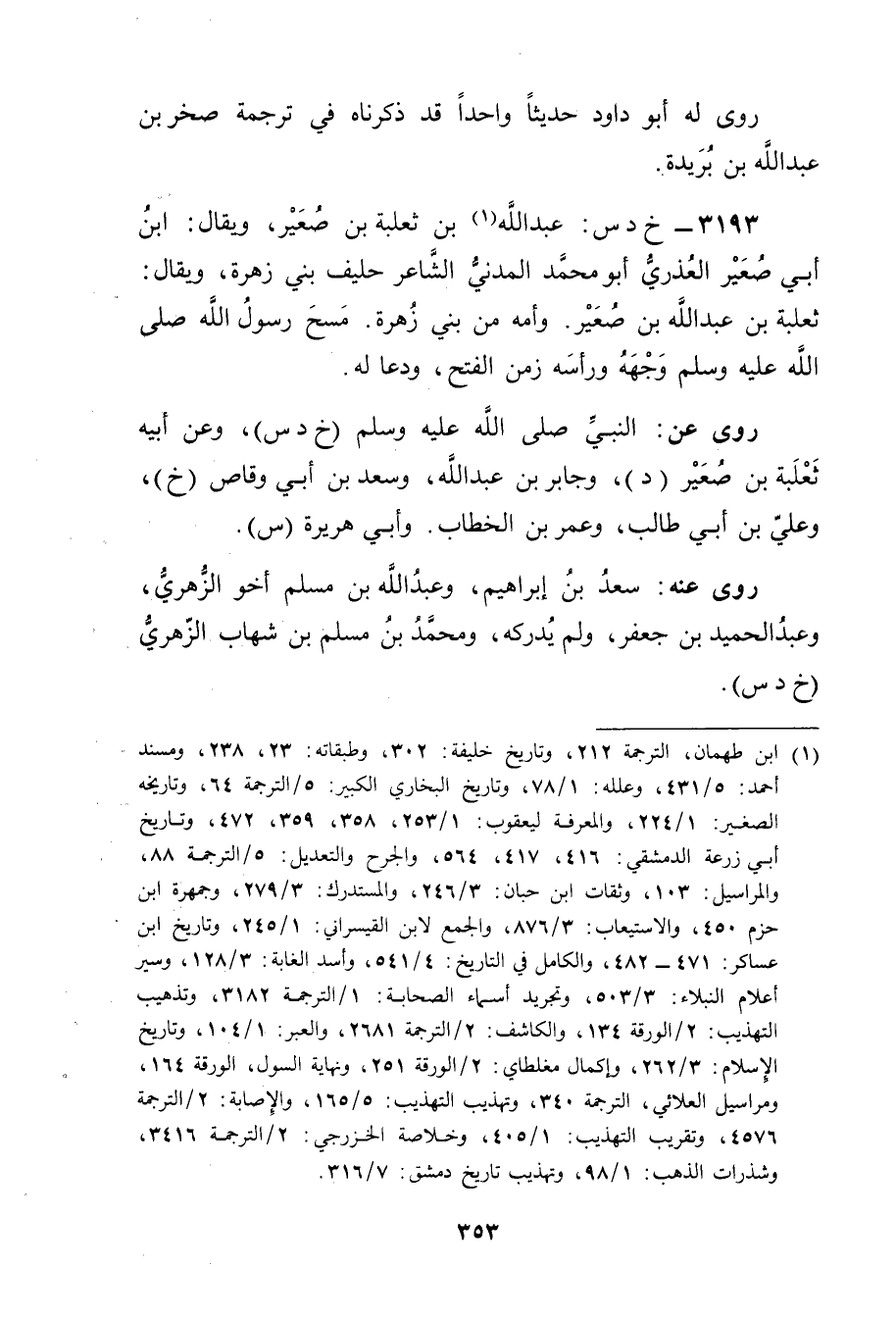 3193 - خ د س: عَبد اللَّهِ بْن ثعلبة بْن صعير (1) ، ويُقال: ابن أَبي صعير العذري أَبُو مُحَمَّد المدني الشاعر حليف بَنِي زهرة، ويُقال: ثعلبة بْن عَبد اللَّهِ بْن صعير. وأمه من بَنِي زهرة. مسح رَسُول اللَّهِ صلى الله عليه وسَلَّمَ وجهه ورأسه زمن الفتح، ودعا لَهُ.