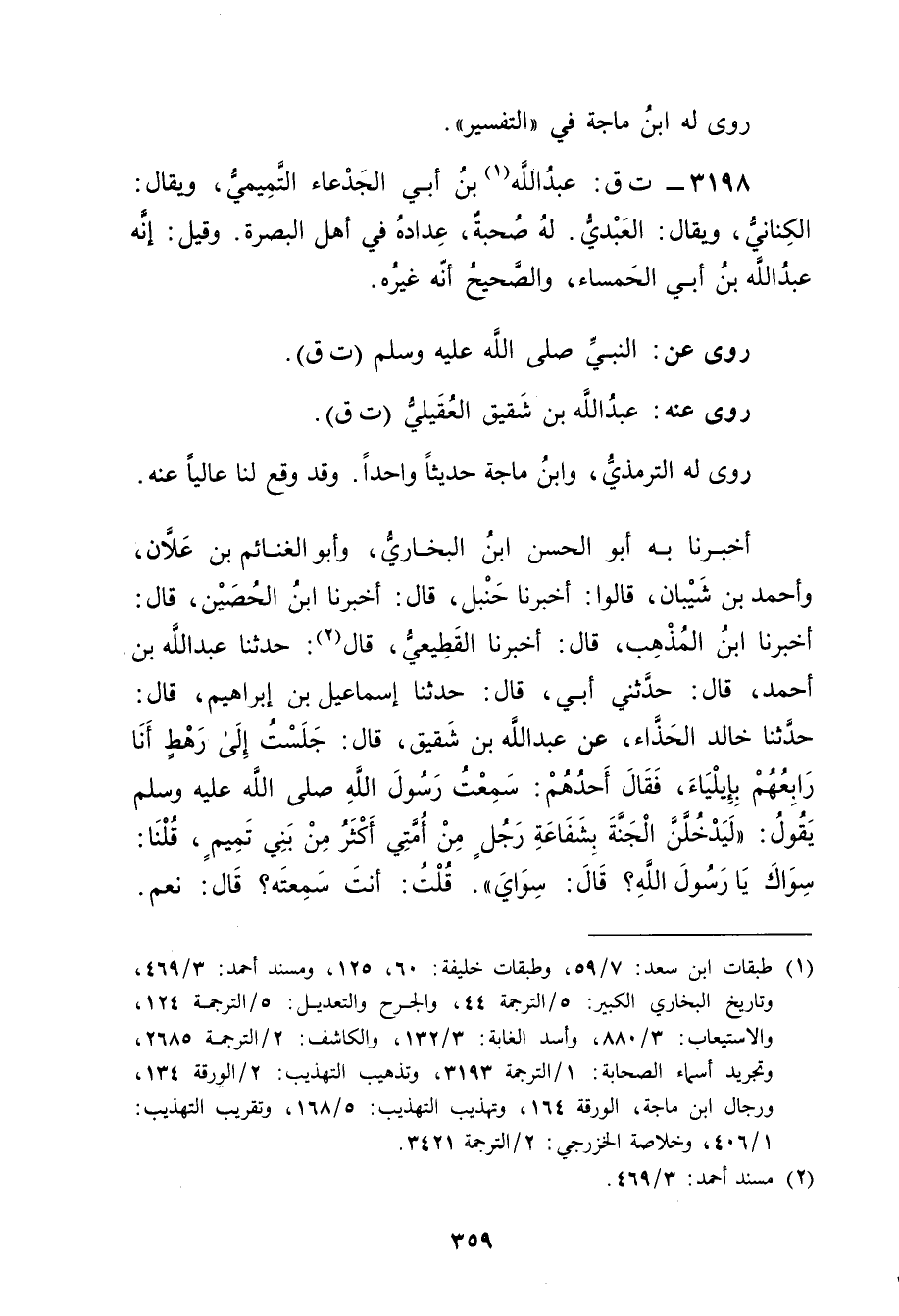 أَخْبَرَنَا بِهِ أَبُو الْحَسَنِ بْنُ الْبُخَارِيِّ، وأَبُو الْغَنَائِمِ بْنُ عَلانَ، وأَحْمَدُ بْنُ شَيْبَانَ، قَالُوا: أخبرنا حنبل، قال: أخبرنا ابن الْحُصَيْنِ، قال: أخبرنا ابْنُ الْمُذْهِب، قال: أخبرنا القَطِيعِيّ، قال (2) : حَدَّثَنَا عَبد اللَّهِ بْن أَحْمَدَ، قال: حَدَّثني أَبِي، قال: حَدَّثَنَا إِسْمَاعِيلُ بْنُ إِبْرَاهِيمَ، قال: حَدَّثَنَا خَالِدٌ الْحَذَّاءُ، عَنْ عَبد اللَّهِ بْنِ شَقِيقٍ، قال: جَلَسْتُ إِلَى رَهْطٍ أَنَا رَابِعُهُمْ بِإِيلْيَاءَ، فَقَالَ أَحَدُهُمْ: سمعت رَسُول اللَّهِ صَلَّى اللَّهُ عَلَيْهِ وسَلَّمَ يَقُولُ: لَيَدْخُلَنَّ الْجَنَّةَ بِشَفَاعَةِ رَجُلٍ مِنْ أُمَّتِي أَكْثَرُ مِنْ بَنِي تَمِيمٍ، قُلْنَا: سِوَاكَ يَا رَسُولَ اللَّهِ؟ قال: سِوَايَ". قُلْت: أَنْتَ سمعته؟ قال: نعم.