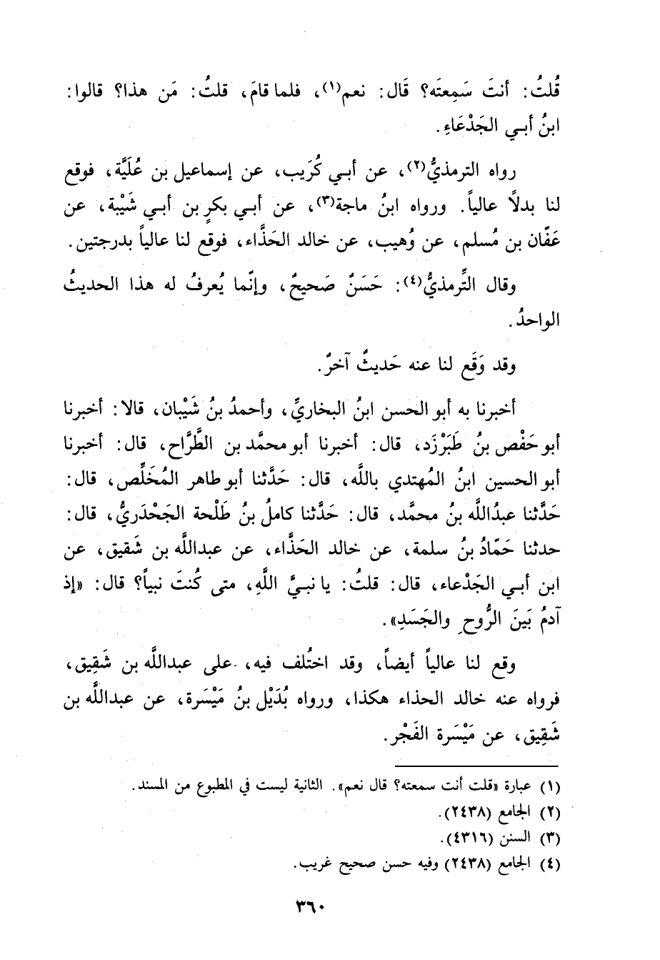 رَوَاهُ التِّرْمِذِيّ (2) ، عَن أَبِي كريب، عَنْ إسماعيل بن علية، فوقع لنا بدلا عاليا. ورَوَاهُ ابْنُ مَاجَهْ (3) ، عَن أَبِي بَكْرِ بْنِ أَبي شَيْبَة، عن عَفَّان بْن مُسْلِم، عَنْ وهيب، عَنْ خَالِد الحذاء، فوقع لنا عاليا بدرجتين.