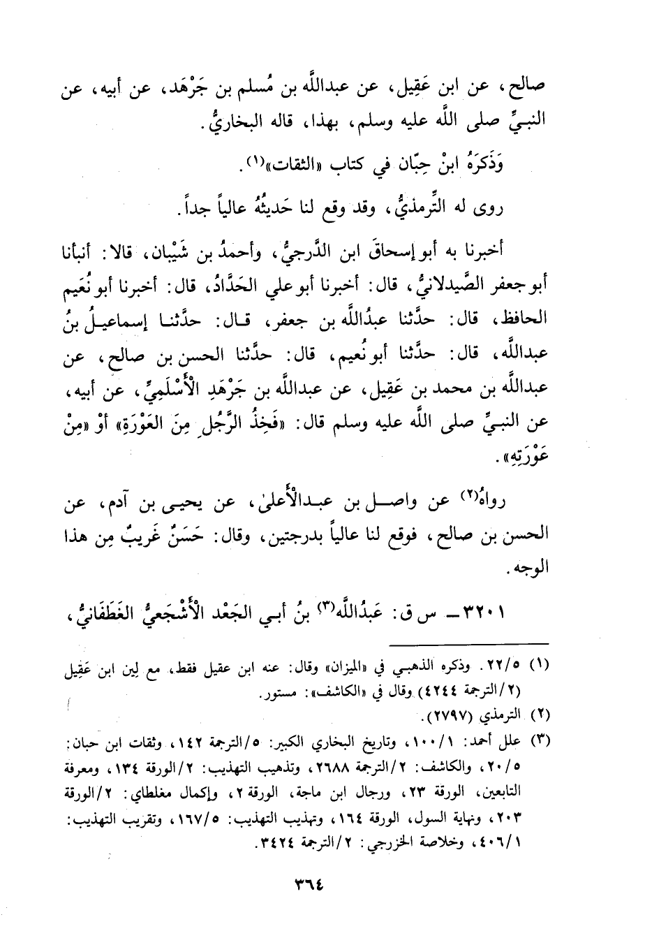 الحافظ، قال: حَدَّثَنَا عَبد الله بْنُ جَعْفَرٍ، قال: حَدَّثَنَا إِسْمَاعِيلُ بْنُ عَبد اللَّهِ، قال: حَدَّثَنَا أَبُو نُعَيْم، قال: حَدَّثَنَا الْحَسَن بْن صالح، عن عَبد الله بْنِ مُحَمد بْنِ عَقِيل، عن عَبد اللَّهِ بن جرهد الأَسلميّ، عَن أَبِيهِ، عَنِ النَّبِيِّ صلى اللَّهُ عَلَيْهِ وسَلَّمَ قال: فَخْذُ الرَّجُلِ مِنَ الْعَوْرَةِ"أَوْ"مِنْ عَوْرَتِهِ.