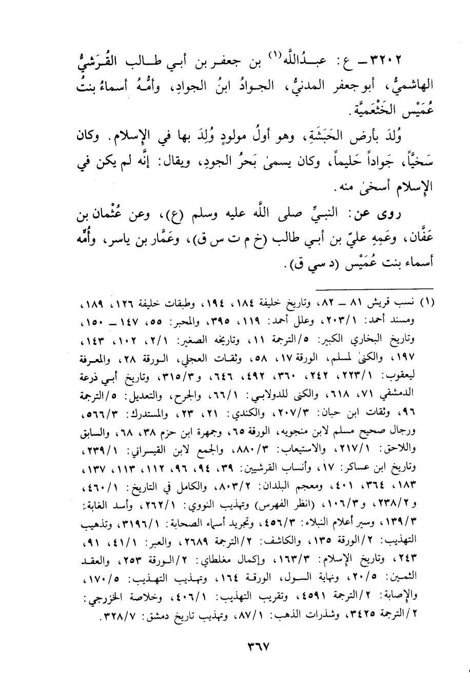 3202 - ع: عَبد اللَّهِ بن جَعْفَر بن أَبي طالب القرشي الهاشمي (1) ، أبو جعفر المدني، الجواد ابن الجواد، وأمه أسماء بنت عميس الخثعمية.