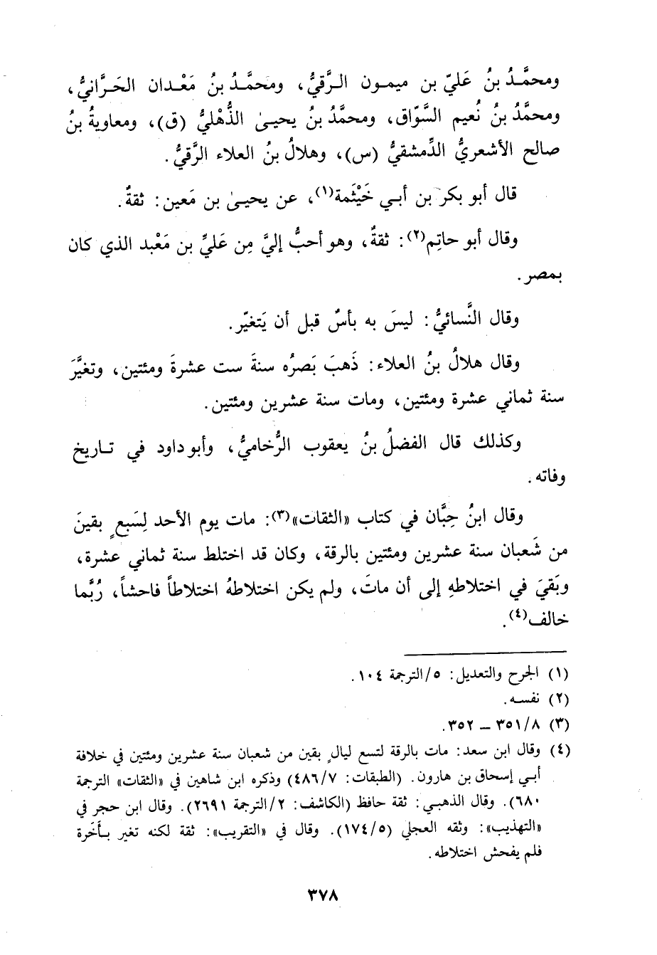(4) وَقَال ابن سعد: مات بالرقة لتسع ليال بقين من شعبان سنة عشرين ومئتين في خلافة أبي إسحاق بْن هارون. (الطبقات: 7 / 486) وذكره ابن شاهين في "الثقات" الترجمة 680) . وَقَال الذهبي: ثقة حافظ (الكاشف: 2 / الترجمة 2691) . وَقَال ابن حجر في "التهذيب": وثقة العجلي (5 / 174) . وَقَال في "التقريب": ثقة لكنه تغير بأخرة فلم يفحش اختلاطه.