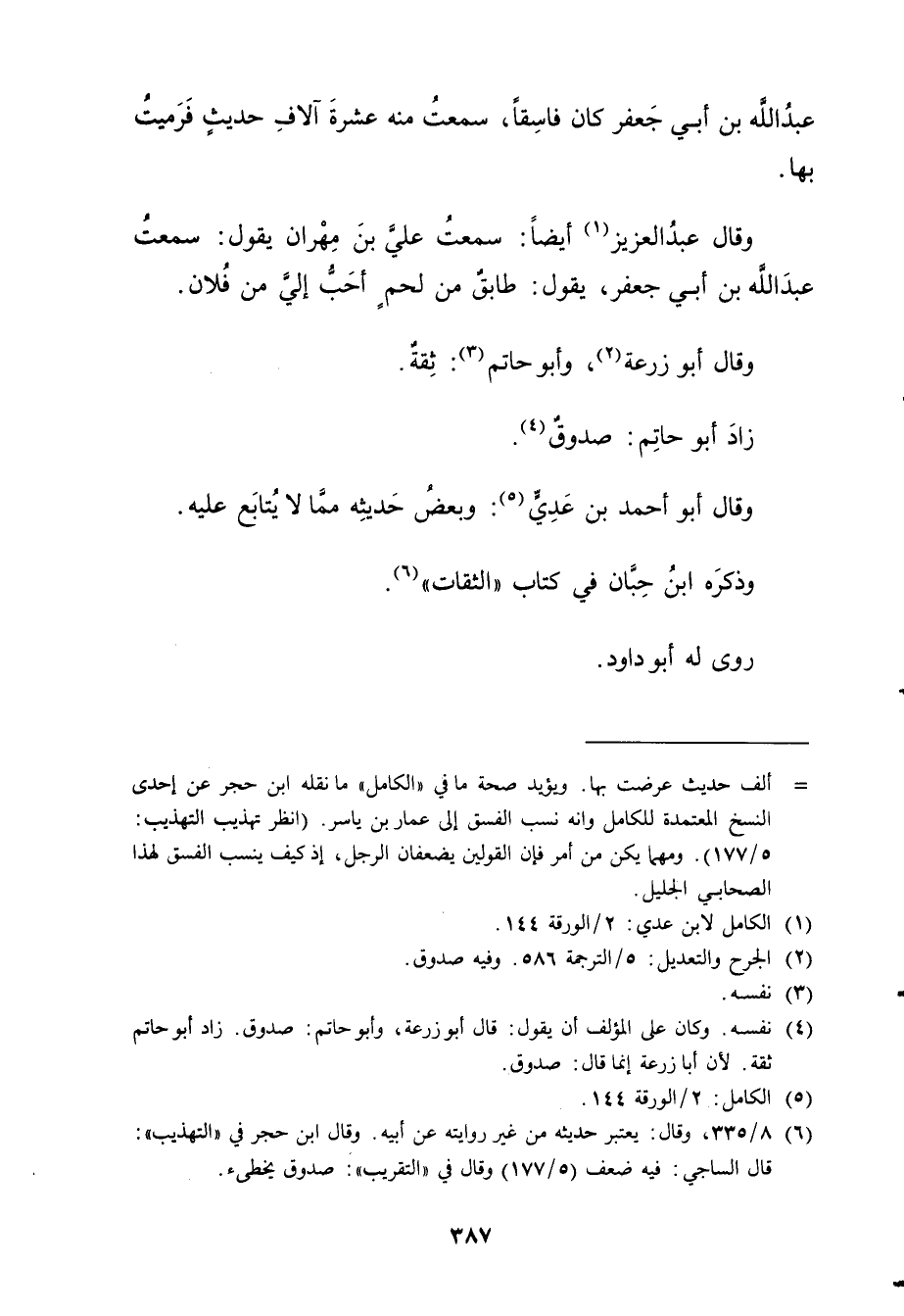 (4) نفسه. وكان على المؤلف أن يقول: قال أبو زُرْعَة، وأبو حاتم: صدوق. زاد أبو حاتم ثقة. لان أبا زرعة إنما قال: صدوق.
