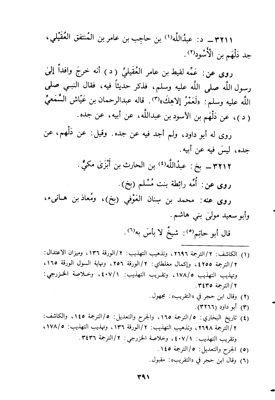 3211 - د: عَبد اللَّهِ بن حاجب بن عامر بن المنتفق العقيلي (1) ، جد دلهم بْن الأسود (2) .