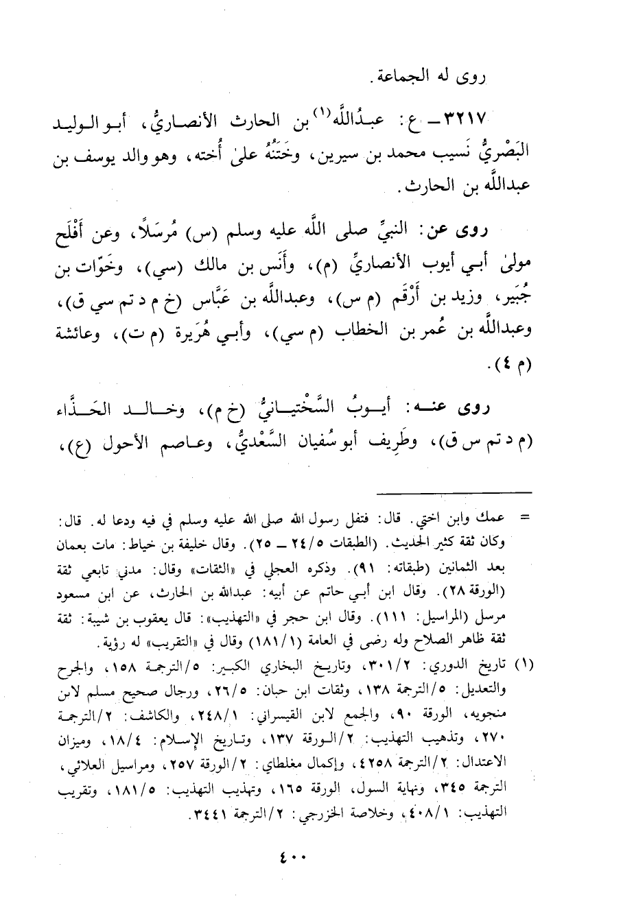 3217 - ع: عَبد اللَّهِ بن الْحَارِث الأَنْصارِيّ (1) ، أَبُو الْوَلِيد البَصْرِيّ نسيب مُحَمَّد بْن سيرين، وختنه عَلَى أخته، وهُوَ والد يُوسُف بْن عَبد اللَّهِ بْن الْحَارِث.