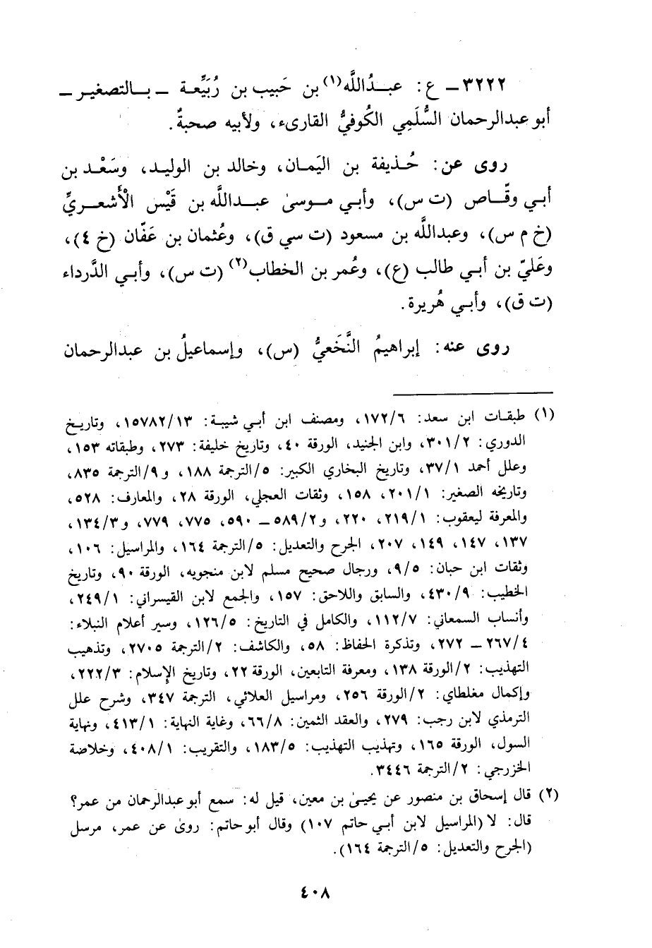 3222 - ع: عَبد اللَّهِ بن حبيب بن ربيعة (1) - بالتصغير - أَبُو عَبْد الرحمن السلمي الكوفي القارئ، ولأبيه صحبة.
