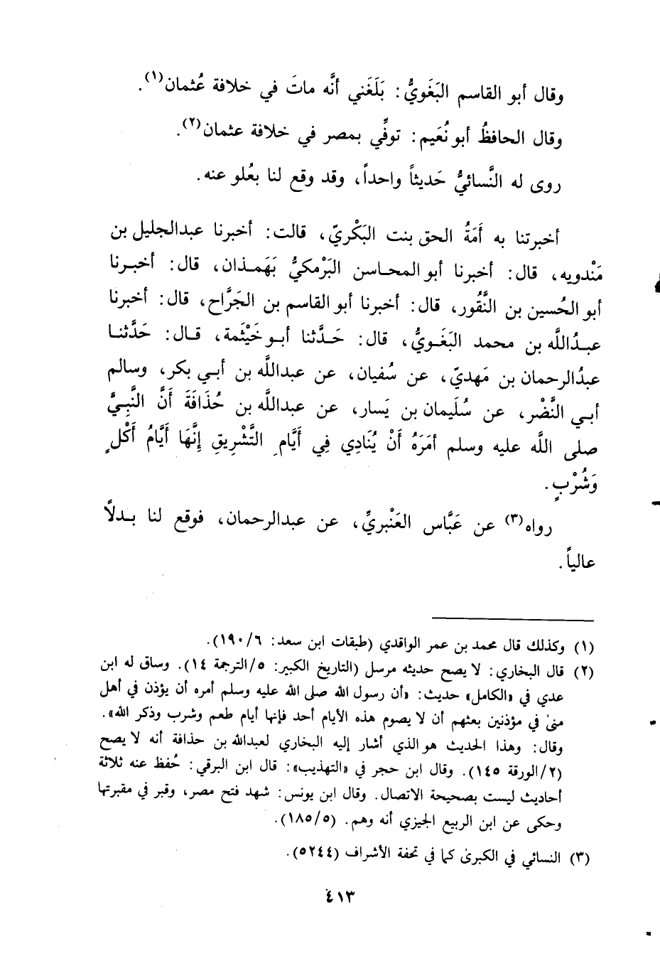 أَخْبَرَتْنَا بِهِ أَمَةُ الْحَقِّ بِنْتُ الْبَكْرِيِّ، قَالَتْ: أَخْبَرَنَا عَبْدُ الْجَلِيلِ بْنُ مَنْدَوَيْهِ، قال: أَخْبَرَنَا أَبُو الْمَحَاسِنِ الْبَرْمَكِيُّ بِهَمَذَانَ، قال: أَخْبَرَنَا أَبُو الْحُسَيْنِ بْن النقور، قال: أَخْبَرَنَا أبو الْقَاسِمِ بْنُ الْجَرَّاحِ، قال: أَخْبَرَنَا عَبد الله بْن مُحَمَّد البغوي، قال: حَدَّثَنَا أَبُو خَيْثَمَةَ، قال: حَدَّثَنَا عَبْد الرحمن بْن مهدي، عَنْ سُفْيَانَ، عَنْ عَبد اللَّهِ بْنِ أَبي بَكْرٍ، وسَالِمِ أَبِي النَّضْرِ، عَنْ سُلَيْمان بْنِ يَسَارٍ، عَنْ عَبد اللَّهِ بْنِ حُذَافَةَ أَنَّ النَّبِيَّ صلى الله عليه وسَلَّمَ أَمَرَهُ أَنْ يُنَادِيَ فِي أيام التشريق أنها أيام أكل وشُرْبٍ.
