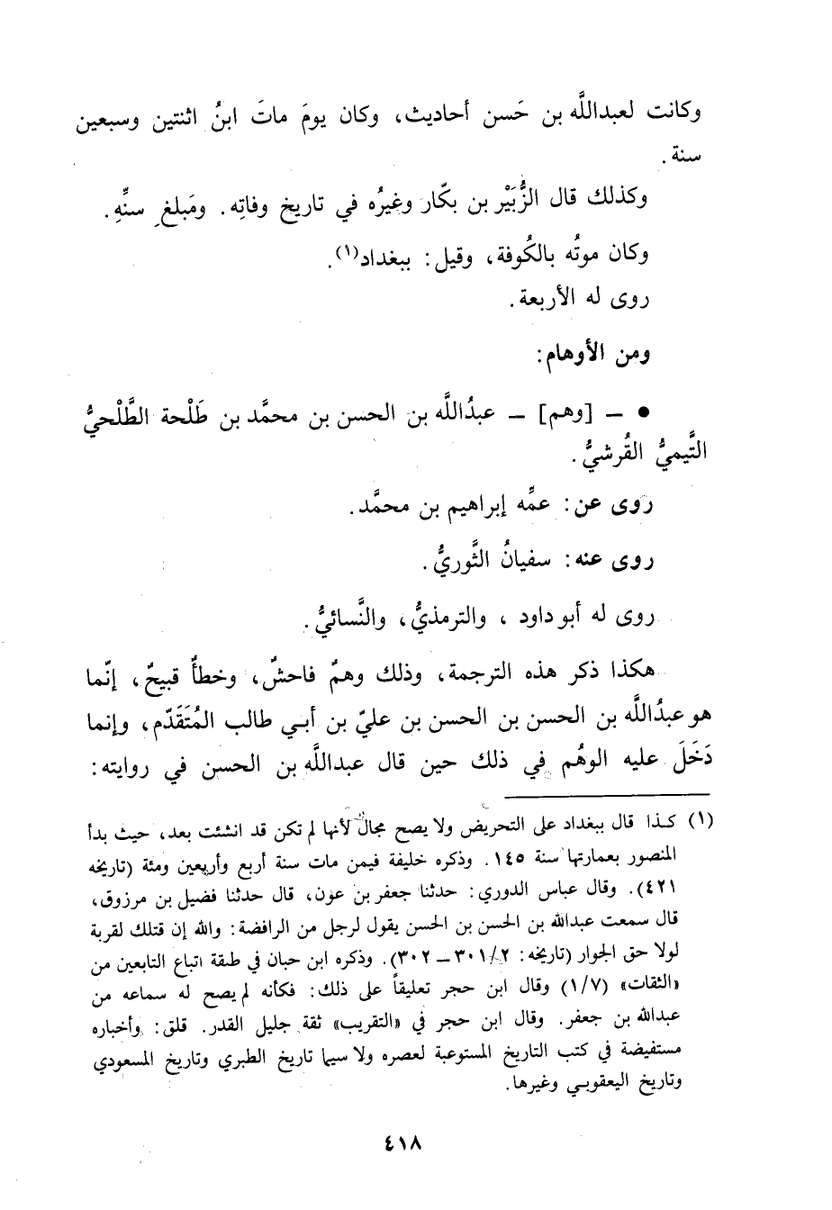 - وَهْمٌ - عَبد اللَّهِ بْن الْحَسَن بْن مُحَمَّد بن طَلْحَة الطلحي التَّيْمِيّ الْقُرَشِي.