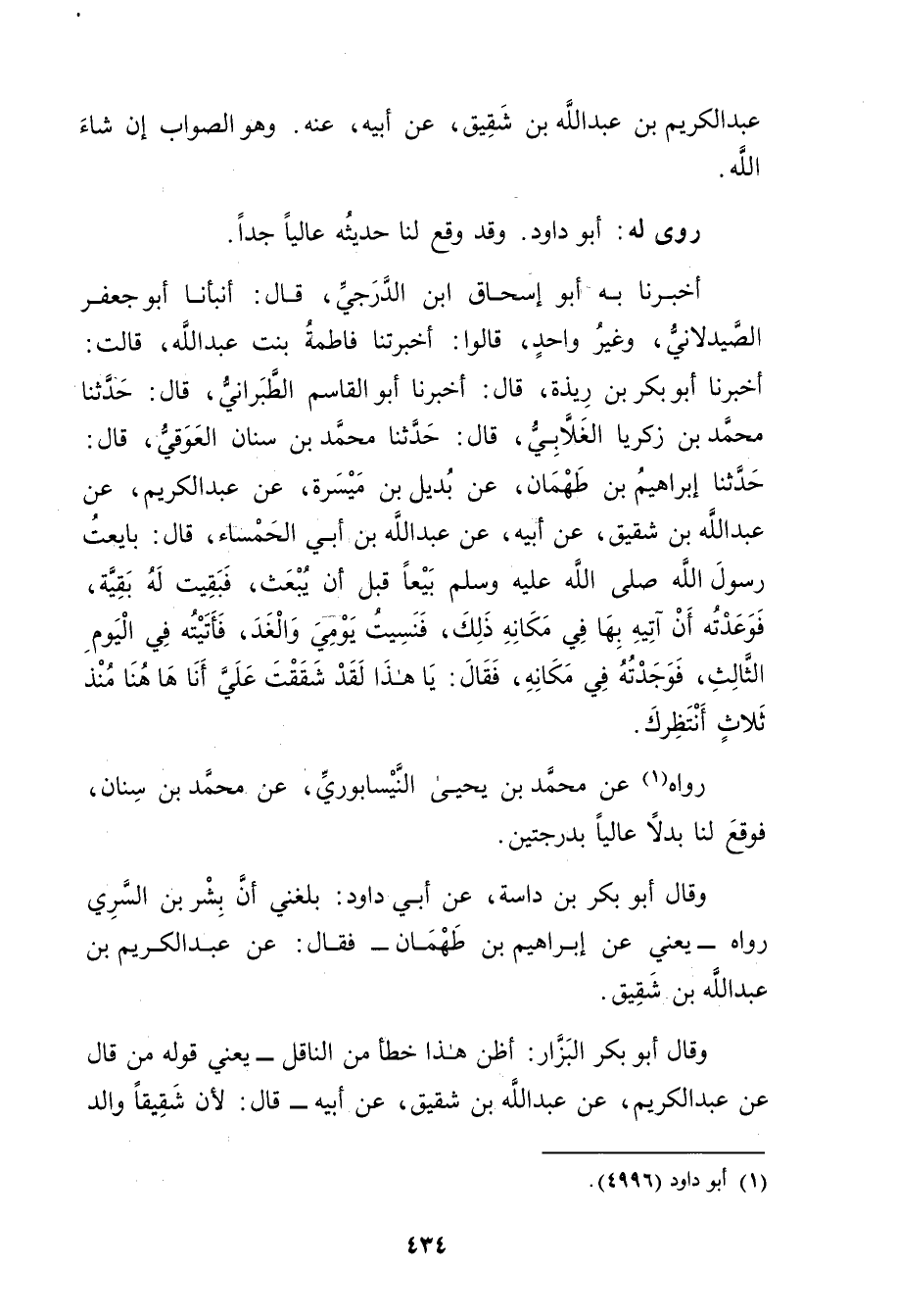 أَخْبَرَنَا بِهِ أَبُو إِسْحَاقَ ابْنُ الدَّرَجِيِّ، قال: أنبأنا أَبُو جَعْفَرٍ الصَّيْدَلانِيُّ، وغَيْرُ واحِدٍ، قَالُوا: أَخْبَرَتْنَا فَاطِمَةُ بِنْتُ عَبد اللَّهِ، قَالَتْ: أخبرنا أَبُو بَكْرِ بْنُ رِيذَةَ، قال: أخبرنا أَبُو الْقَاسِمِ الطَّبَرَانِيُّ، قال: حَدَّثَنَا مُحَمَّدُ بْنُ زَكَرِيَّا الْغَلابِيُّ، قال: حَدَّثَنَا مُحَمَّدُ بْنُ سِنَانٍ الْعَوَقِيُّ، قال: حَدَّثَنَا إِبْرَاهِيمُ بْنُ طَهْمَانَ، عَنْ بُدَيْلِ بْنِ مَيْسَرَةَ، عَنْ عَبْدِ الْكَرِيمِ، عَنْ عَبد اللَّهِ بْنِ شَقِيقٍ، عَن أَبِيهِ، عَنْ عَبد اللَّهِ بْنِ أَبي الْحَمْسَاءِ، قال: بَايَعْتُ رَسُولَ اللَّهِ صلى الله عليه وسلم بَيْعًا قَبْلَ أَنْ يُبْعَثَ، فَبَقِيَتْ لَهُ بَقِيَّةٌ، فَوَعَدْتُهُ أَنْ آتِيَهُ بِهَا فِي مَكَانِهِ ذَلِكَ، فَنَسِيتُ يَوْمِي والْغَدَ، فَأَتَيْتُهُ فِي الْيَوْمِ الثَّالِثِ، فَوَجَدْتُهُ فِي مَكَانِهِ، فَقَالَ: يَا هَذَا لَقَدْ شَقَقْتَ عَلِيَّ أنا ها هنا مُنْذُ ثَلاثٍ أَنْتَظِرُكَ.