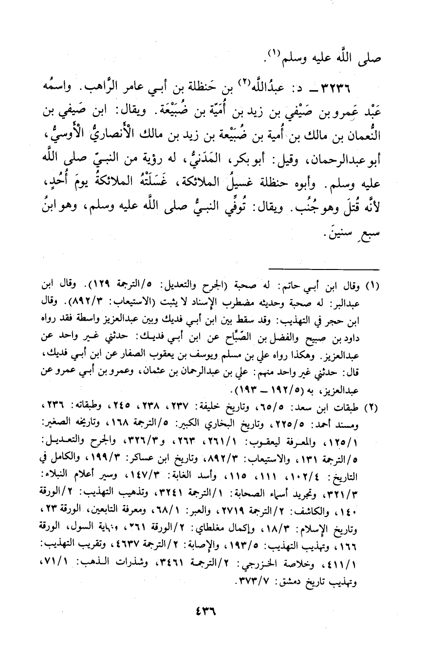3236 - د: عَبد اللَّهِ بْنِ حَنْظَلَةَ بْنِ أَبي عَامِر الراهب (2) . واسمه عَبْد عَمْرو بْن صيفي بْن زَيْد بْن أمية بْن ضبيعة. ويُقال: ابْن صيفي بْن النعمان بْن مَالِك بْن أمية بْن ضبيعة بْن زَيْد بْن مَالِك الأَنْصارِيّ الأوسي، أَبُو عَبْد الرحمن، وقيل: أَبُو بَكْر، المدني، لَهُ رؤية من النَّبِيّ صَلَّى اللَّهُ عَلَيْهِ وسَلَّمَ.