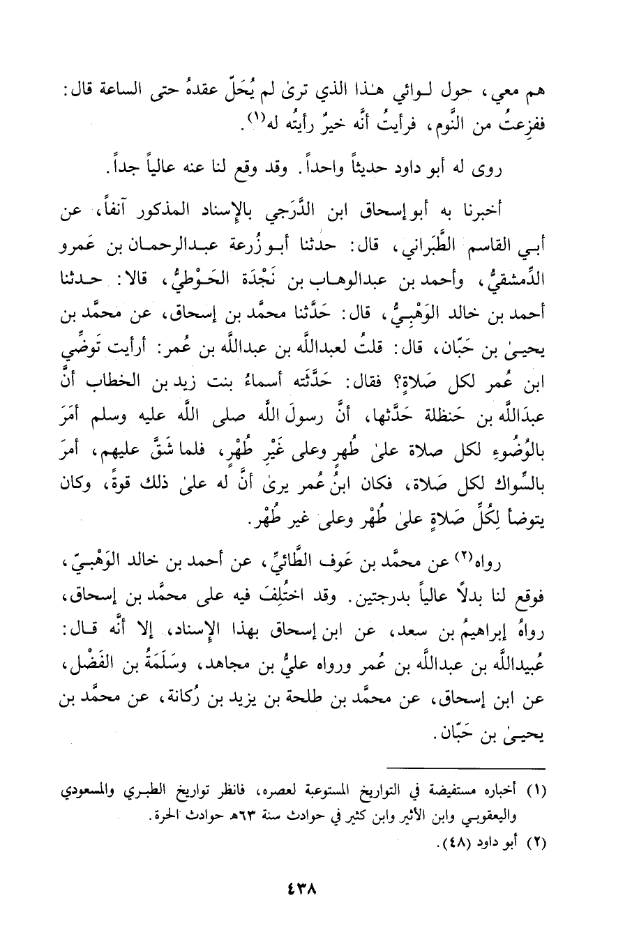 أَبِي الْقَاسِمِ الطَّبَرَانِيِّ، قال: حَدَّثَنَا أَبُو زُرْعَة عَبْدُ الرَّحْمَنِ بْنُ عَمْرو الدِّمَشْقِيُّ، وأَحْمَدُ بْنُ عَبْدِ الْوَهَّابِ بْنِ نَجْدَةَ الْحُوطِيُّ، قَالا: حَدَّثَنَا أَحْمَدُ بْنُ خَالِدٍ الْوَهْبِيُّ، قال: حَدَّثَنَا مُحَمَّد بْن إسحاق، عَنْ مُحمد بْن يَحيى بْن حَبَّان، قال: قُلْتُ لِعَبْدِ اللَّهِ بْن عَبد اللَّهِ بْن عُمَر: أَرَأَيْتَ تَوَضِّيَ ابْنِ عُمَر لِكُلِّ صَلاةٍ؟ فَقَالَ: حَدَّثَتْهُ أَسْمَاءُ بِنْتُ زَيْدِ بْنِ الْخَطَّابِ أَنَّ عَبد اللَّهِ بْنَ حَنْظَلَةَ حَدَّثَهَا، أَنَّ رَسُول اللَّهِ صلى الله عليه وسَلَّمَ أَمَرَ بِالْوُضُوءِ لِكُلِّ صَلاةٍ عَلَى طُهْرٍ وعَلَى غَيْرِ طُهْرٍ، فَلَمَّا شَقَّ عَلَيْهِمْ، أَمَرَ بِالسِّوَاكِ لِكُلِّ صَلاةٍ، فكان ابْن عُمَر يرى أَن لَهُ عَلَى ذَلِكَ قوة، وكَانَ يتوضأ لكل صلاة عَلَى طُهْرٍ وعَلَى غَيْرِ طُهْرٍ.