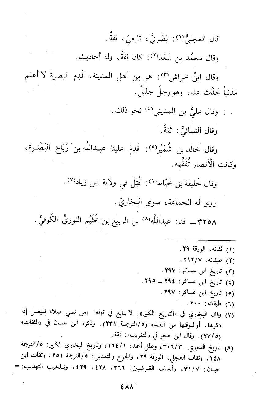 (8) تاريخ الدوري: 3 / 306، وعلل أحمد: 1 / 164، وتاريخ البخاري الكبير: 5 / الترجمة 248، وثقات العجلي، الورقة 29، والجرح والتعديل: 5 / الترجمة 251، وثقات ابن حبان: 7 / 31، وأنساب القرشيين: 366، 428، 429، وتذهيب التهذيب: =