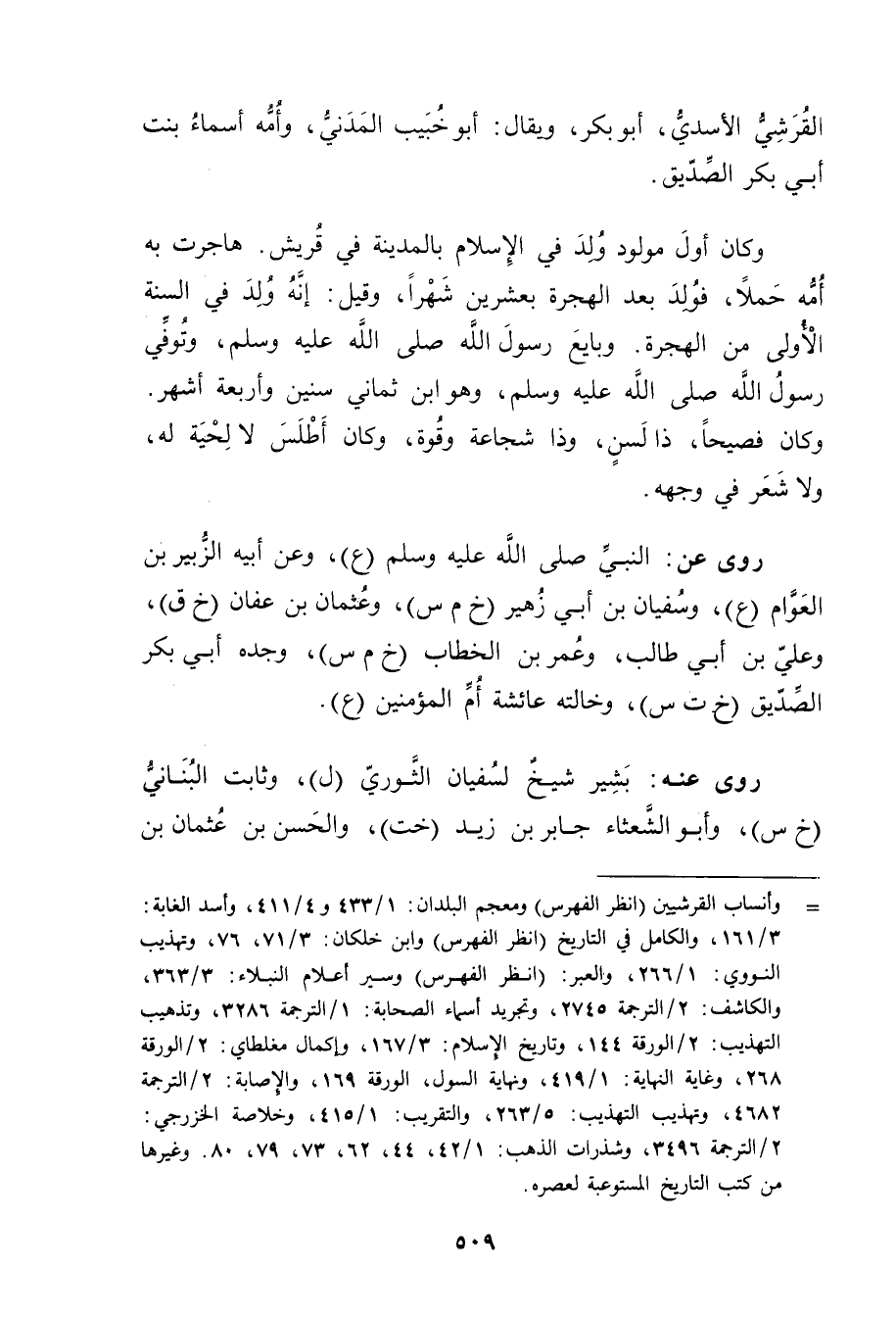 = وأنساب القرشيين، ومعجم البلدان: 1 / 433، و4 / 411، وأسد الغابة. 3 / 161، والكامل في التاريخ، وابن خلكان: 3 / 71، 76، وتهذيب النووي: 1 / 266، والعبر:، وسير أعلام النبلاء: 3 / 363، والكاشف: 2 / الترجمة 2745، وتجريد أسماء الصحابة: 1 / الترجمة 3286، وتذهيب التهذيب: 2 / الورقة 144، وتاريخ الاسلام: 3 / 167، وإكمال مغلطاي: 2 / الورقة 268، وغاية النهاية: 1 / 419، ونهاية السول، الورقة 169، والاصابة: 2 / الترجمة 4682، وتذهيب التهذيب: 5 / 263، والتقريب: 1 / 415، وخلاصة الخزرجي: 2 / الترجمة 3496، وشذرات الذهب: 1 / 42، 44، 73 62، 79، 80. وغيرها من كتب التاريخ المستوعبة لعصره.