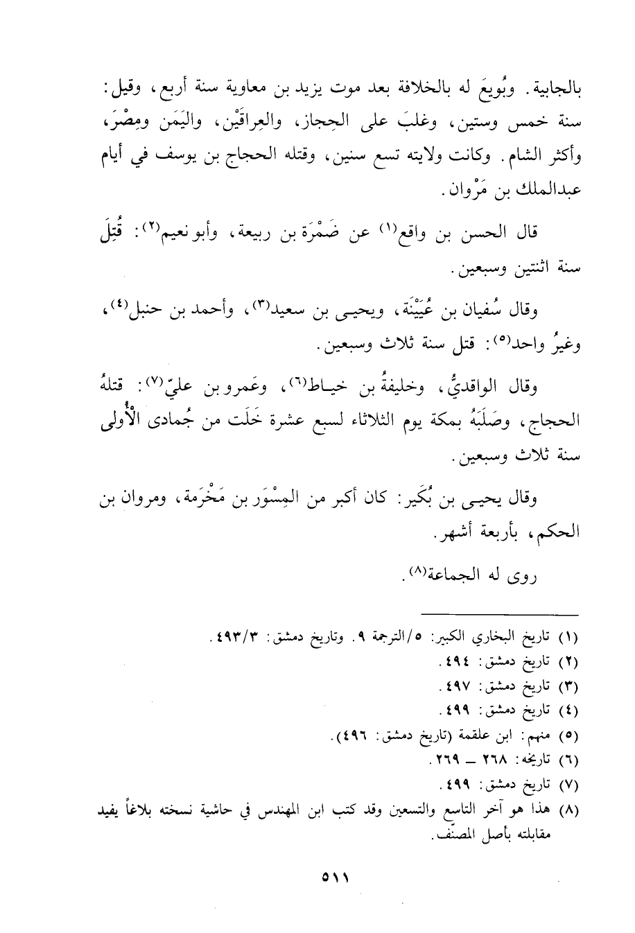 وَقَال سُفْيَان بْن عُيَيْنَة، ويَحْيَى بْن سَعِيد (3) ، وأَحْمَد بْن حَنْبَل (4) ، وغير واحد (5) : قتل سنة ثَلاث وسبعين.
