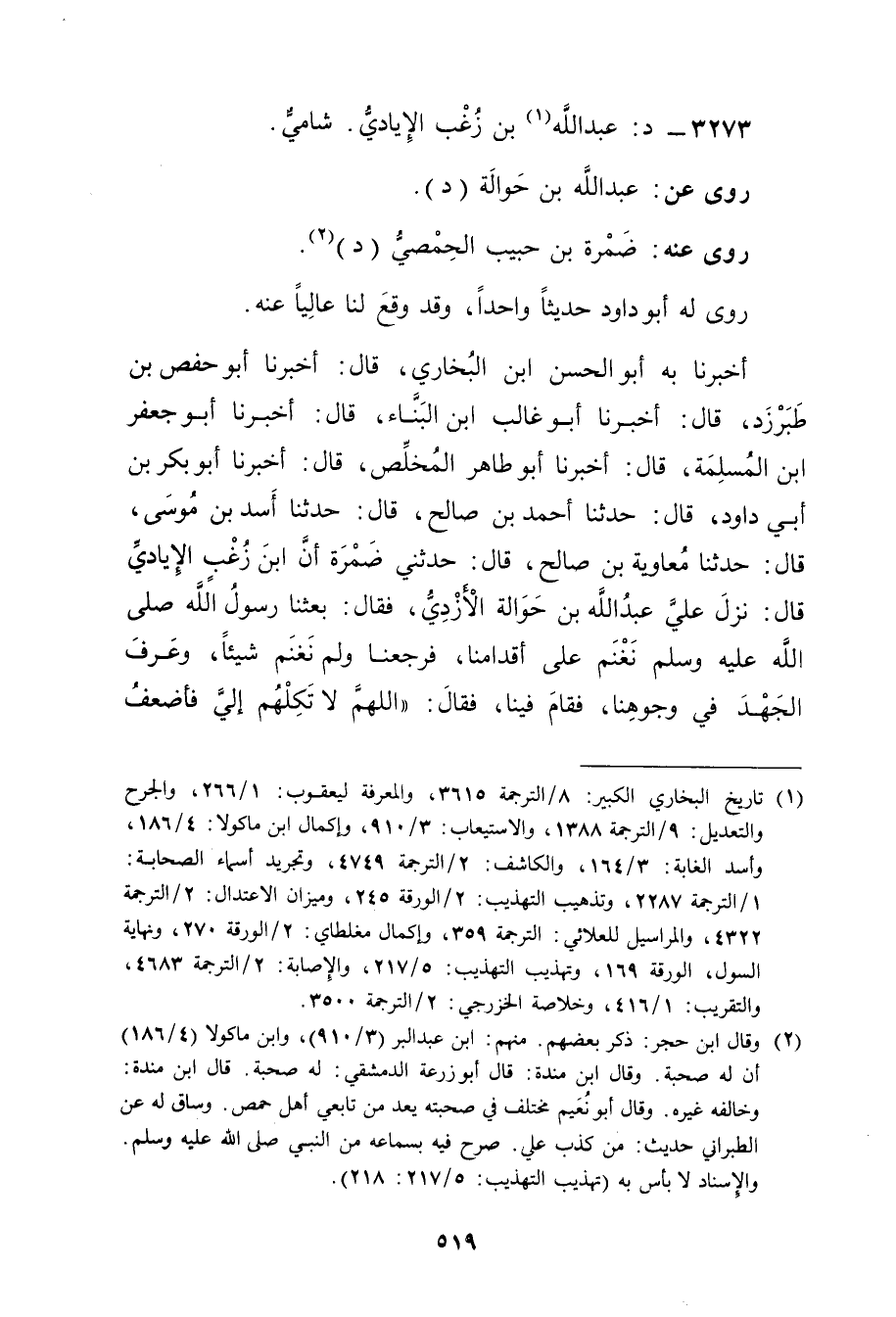 أَخْبَرَنَا بِهِ أَبُو الحسن بْن البخاري، قال: أَخْبَرَنَا أبو حفص بن طَبَرْزَذَ، قال: أخبرنا أَبُو غالب ابْن الْبَنَّاءِ، قال: أَخْبَرَنَا أَبُو جَعْفَرِ ابْنُ الْمُسْلِمَةِ، قال: أَخْبَرَنَا أَبُو طاهر المخلص، قال: أَخْبَرَنَا أَبُو بَكْرِ بْن أَبي دَاوُد، قال: حَدَّثَنَا أَحْمَد بْن صالح، قال: حَدَّثَنَا أَسَدُ بْنُ مُوسَى، قال: حَدَّثَنَا معاوية بْن صَالِح، قال: حَدَّثَنِي ضَمُرَةُ أَنَّ ابْنَ زُغْبٍ الإِيَادِيَّ قال: نَزَلَ عَلِيَّ عَبد اللَّهِ بْنُ حَوَالَةَ الأَزْدِيُّ، فَقَالَ: بَعَثَنَا رَسُولُ اللَّهِ صَلَّى اللَّهُ عَلَيْهِ وسَلَّمَ نَغْنَمُ عَلَى أَقْدَامِنَا، فَرَجَعْنَا ولَمْ نَغْنَمْ شَيْئًا، وعَرَفَ الْجَهْدَ فِي وجُوهِنَا، فَقَامَ فِينَا، فَقَالَ: اللَّهُمَّ لا تَكِلْهُمْ إِلَيَّ فأضعف