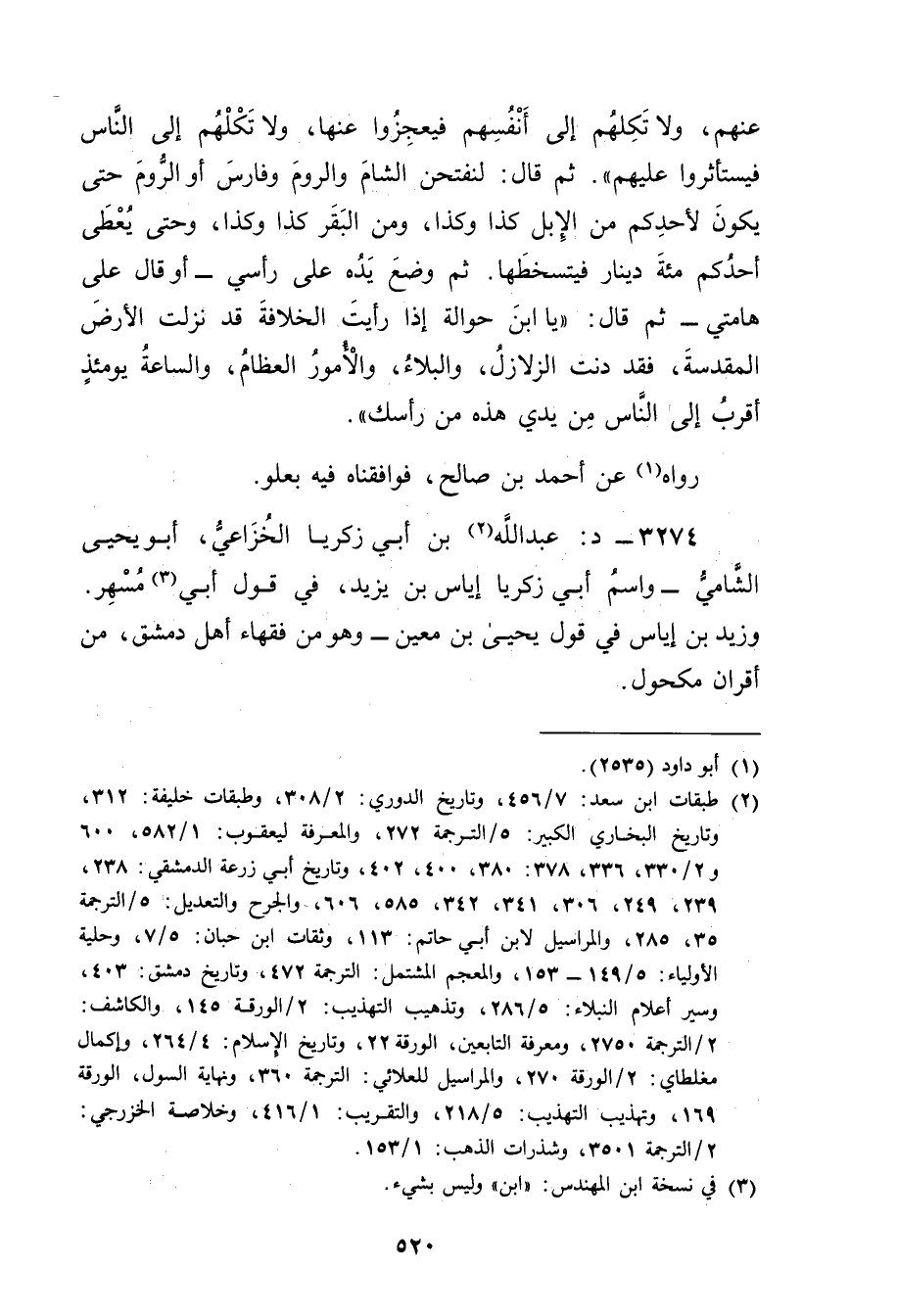 3274 - د: عَبد اللَّهِ بن أَبي زكريا الخزاعي (2) ، أبويحيى الشامي - واسم أَبِي زَكَرِيَّا إياس بْن يَزِيد، فِي قَوْل أَبِي (3) مسهر. وزيد بْن إياس فِي قَوْل يَحْيَى بْن مَعِين - وهُوَ من فقهاء أَهل دمشق، من أقران مكحول.