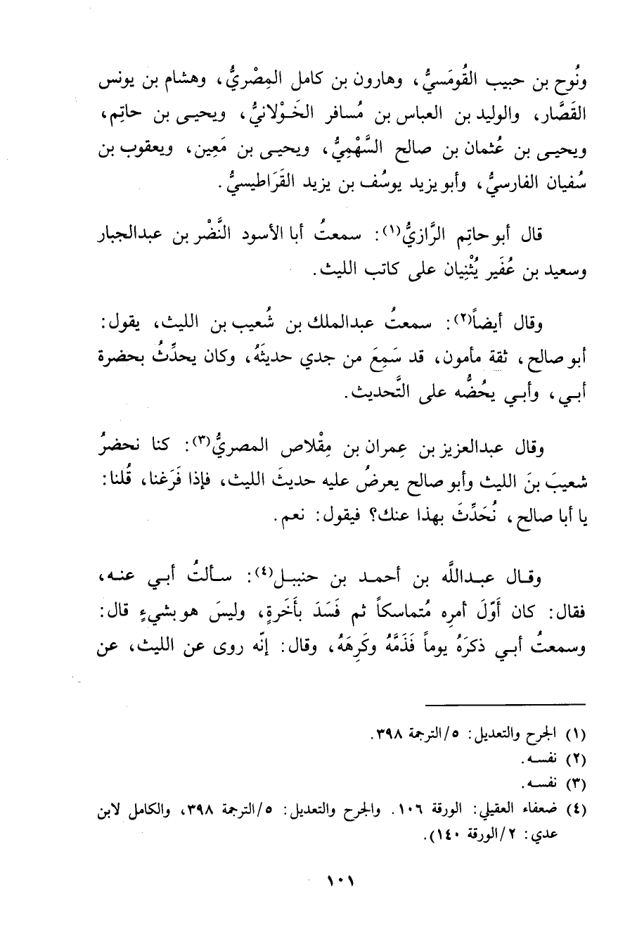 قال أَبُو حاتم الرازي (1) : سمعت أبا الأسود النضر بن عَبْدِ الْجَبَّارِ وسَعِيد بن عفير يثنيان على كاتب الليث.