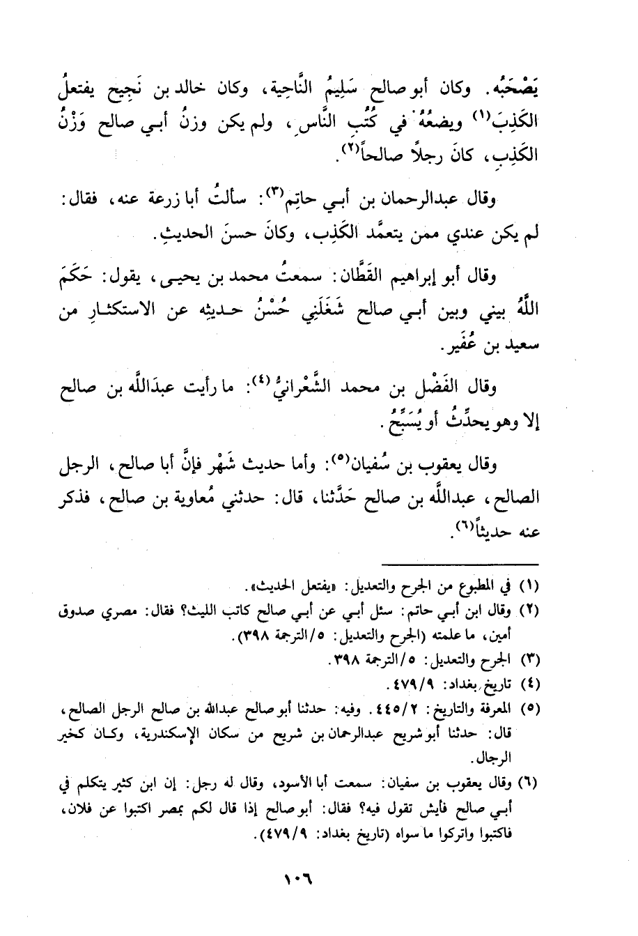 (2) وَقَال ابن أَبي حاتم: سئل أبي عَن أَبِي صالح كاتب الليث؟ فقال: مصري صدوق أمين، ما علمته (الجرح والتعديل: 5 / الترجمة 398) .