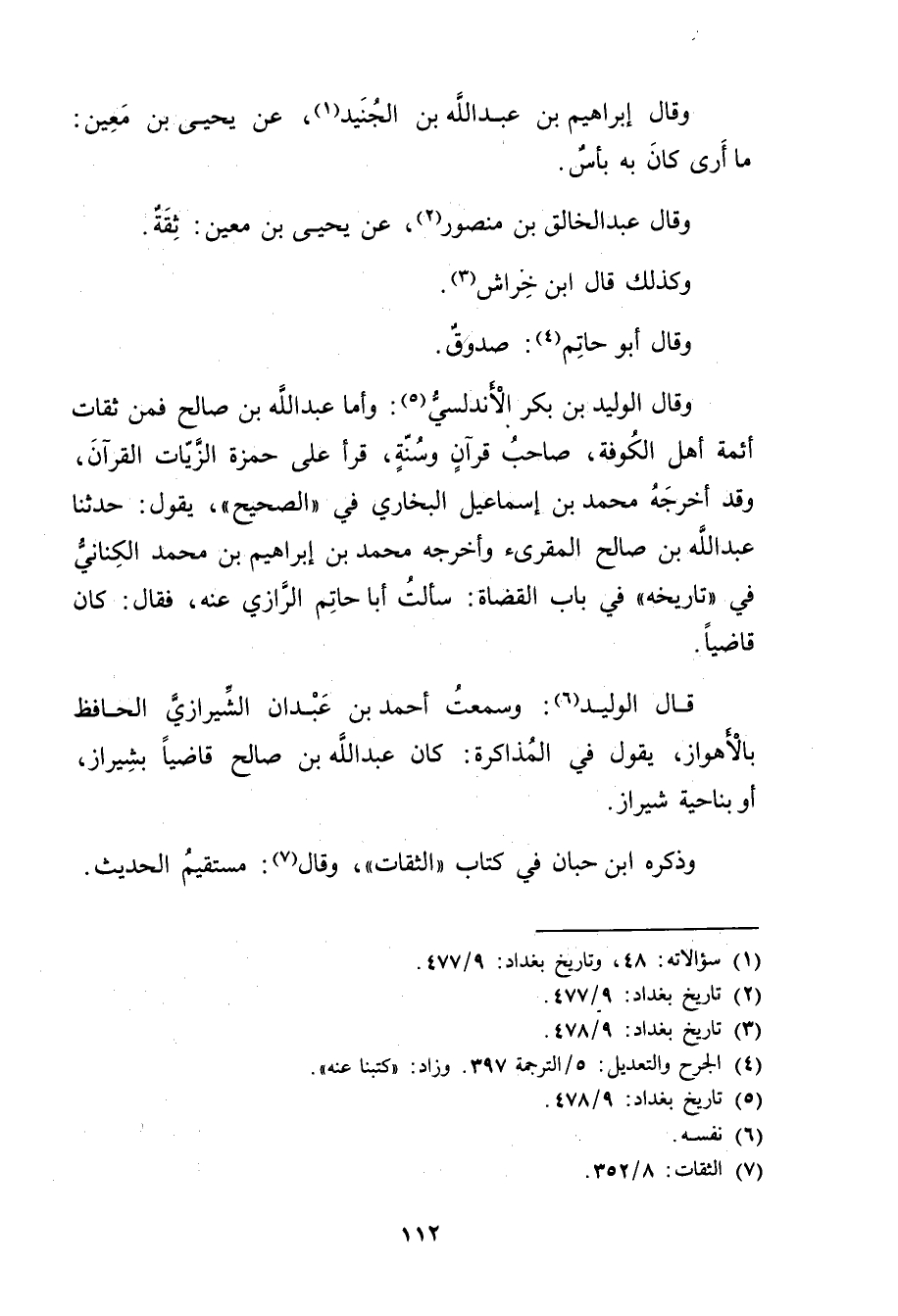 وَقَال الوليد بن بكر الأندلسي (5) : وأما عَبد اللَّهِ بن صَالِحٍ فمن ثقات أئمة أهل الكوفة، صاحب قرآن وسنة، قرأ على حمزة الزيات القرآن، وقد أخرجه محمد بن إِسْمَاعِيلَ البخاري فِي "الصحيح"، يَقُولُ: حَدَّثَنَا عَبد اللَّهِ بْنُ صالح المقرئ وأخرجه محمد بن إِبْرَاهِيمَ بن محمد الكناني فِي "تاريخه"فِي باب القضاة: سألت أبا حاتم الرازي عَنْهُ، فَقَالَ: كَانَ قاضيا.
