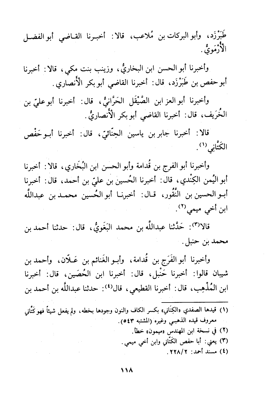 وأخبرنا أَبُو الْفَرَجِ بْنُ قُدَامَةَ وأَبُو الْحَسَنِ بْنُ الْبُخَارِيِّ، قَالا: أَخْبَرَنَا أَبُو اليُمْنِ الْكِنْدِيُّ، قال: أَخْبَرَنَا الْحُسَيْنُ بْنُ عَلِيِّ بْنِ أَحْمَدَ، قال: أَخْبَرَنَا أَبُو الْحُسَيْنِ بْن النقور، قال: أَخْبَرَنَا أبو الْحُسَيْنِ مُحَمَّدُ بْنُ عَبد اللَّهِ بن أَخِي مِيمِي (2) .