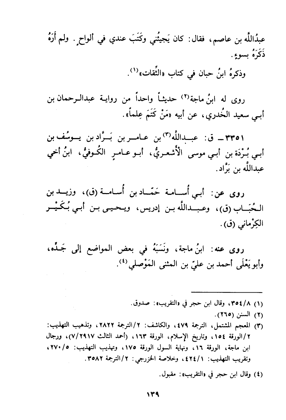 (3) المعجم المشتمل، الترجمة 479، والكاشف: 2 / الترجمة 2822، وتذهيب التهذيب: 2 / الورقة 154، وتاريخ الاسلام، الورقة 163، (أحمد الثالث 2917 / 7) ، ورجال ابن ماجة، الورقة 16، ونهاية السول الورقة 175، وتهذيب التهذيب: 5 / 270، وتقريب التهذيب: 1 / 424، وخلاصة الخزرجي: 2 / الترجمة 3582.