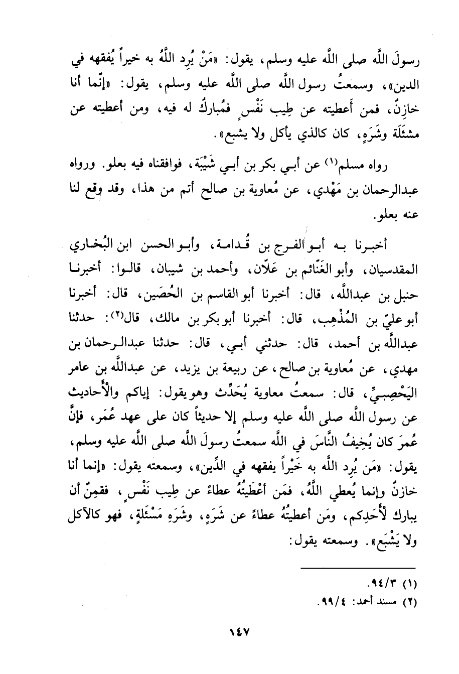 أخبرنا بِهِ أَبُو الْفَرَجِ بْنُ قُدَامَةَ، وأَبُو الْحَسَنِ بْنُ الْبُخَارِيِّ الْمَقْدِسِيَّانِ، وأبو الغنائم بْن علان، وأحمد بْنُ شَيْبَانَ، قَالُوا: أَخْبَرَنَا حَنْبَلُ بْن عَبد الله، قال: أَخْبَرَنَا أبو القاسم بْن الحصين، قال: أَخْبَرَنَا أبو علي بْن المذهب، قال: أَخْبَرَنَا أبو بكر بْن مالك، قال (2) : حَدَّثَنَا عَبد الله بْن أَحْمَدَ، قال: حَدَّثني أبي، قال: حَدَّثَنَا عَبْد الرحمن بْن مَهْدِيٍّ، عَنْ مُعَاوِيَةَ بْنِ صَالِحٍ، عَنْ رَبِيعَةَ بْنِ يَزِيدَ، عَنْ عَبد الله بْن عامر اليحصبي، قال: سَمِعْتُ مُعَاوِيَةَ يُحَدِّثُ وهُوَ يَقُولُ: إِيَّاكُمْ والأَحَادِيثَ عَنْ رَسُولِ اللَّهِ صلى الله عليه وسلم إِلا حَدِيثًا كَانَ عَلَى عَهْدِ عُمَر، فَإِنَّ عُمَر كَانَ يُخِيفُ النَّاسَ فِي اللَّهِ سَمِعْتُ رَسُولَ اللَّهِ صلى الله عليه وسلم، يَقُولُ: مَنْ يُرُدِ اللَّهُ بِهِ خَيْرًا يُفَقِّهْهُ فِي الدِّينِ"، وسَمِعْتُهُ يَقُولُ: إِنَّمَا أَنَا خَازِنٌ وإِنَّمَا يُعْطِي اللَّهُ، فَمَنْ أَعْطَيْتُهُ عَطَاءً عَنْ طِيبِ نَفْسٍ، فَقَمِنٌ أَنْ يبارك لاحدكم، ومن أعطيته عطاء عَنْ شَرَهٍ، وشَرَهِ مَسْأَلَةٍ، فَهُوَ كَالآكِلِ ولا يَشْبَعُ". وسَمِعْتُهُ يَقُولُ: