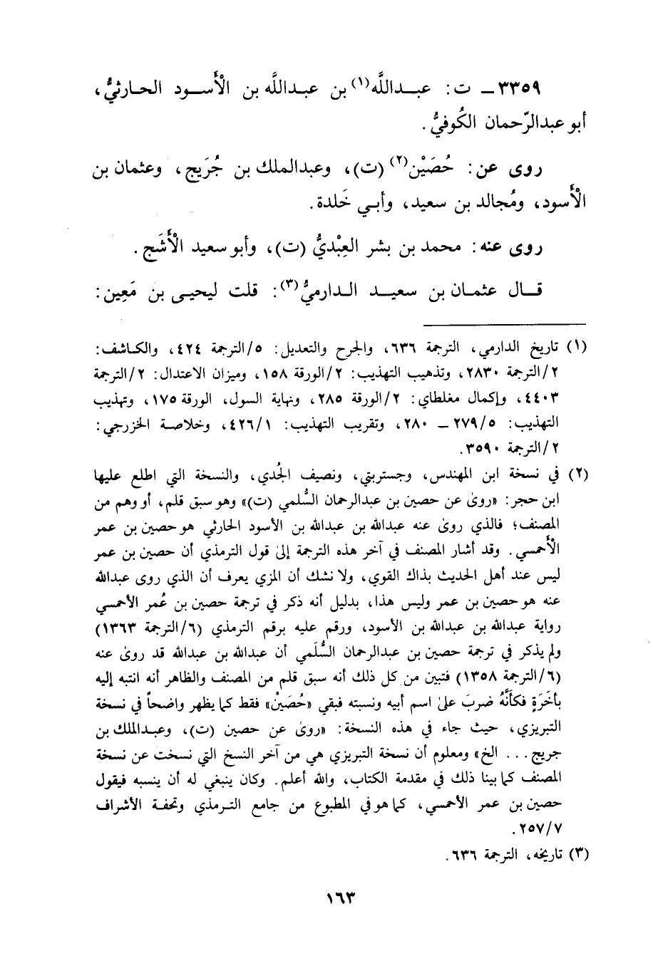 (2) في نسخة ابن المهندس، وجستربتي، ونصيف الجدي، والنسخة التي اطلع عليها ابن حجر: روى عن حصين بن عبد الرحمن السلمي (ت) "وهو سبق قلم، أو وهم من المصنف ; فالذي روى عنه عَبد الله بن عَبد الله بن الأسود الحارثي هو حصين بن عُمَر الاحمسي. وقد أشار المصنف في آخر هذه الترجمة إلى قول التِّرْمِذِيّ أن حصين بن عُمَر ليس عند أهل الحديث بذاك القوي، ولا نشك أن المزي يعرف أن الذي روى عَبد الله عنه هو حصين بن عُمَر وليس هذا، بدليل أنه ذكر في ترجمة حصين بن عُمَر الاحمسي رواية عَبد الله بن عَبد الله بن الأسود، ورقم عليه برقم التِّرْمِذِيّ (6 / الترجمة 1363) ولم يذكر في ترجمة حصين بن عبد الرحمن السلمي ان عَبد الله بن عَبد الله قد روى عنه (6 / الترجمة 1358) فتبين من كل ذلك أنه سبق قلم من المصنف والظاهر أنه انتبه إليه بأخرة فكأنه ضرب على اسم ابيه ونسبته فبقي"حصين"فقط كما يظهر واضحا في نسخة التبريزي، حيث جاء في هذه النسخة: روى عن حصين (ت) ، وعبد الملك بن جُرَيْج ... الخ"ومعلوم أن نسخة التبريزي هي من آخر النسخ التي نسخت عن نسخة المصنف كما بينا ذلك في مقدمة الكتاب، والله أعلم. وكان ينبغي له أن ينسبه فيقول حصين بن عُمَر الاحمسي، كما هو في المطبوع من جامع التِّرْمِذِيّ وتحفة الاشراف 7 / 257.