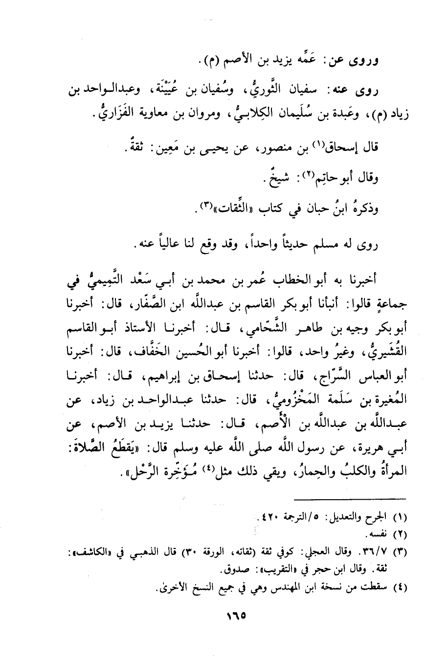 أَخْبَرَنَا بِهِ أَبُو الْخَطَّابِ عُمَر بْن مُحَمَّد بْن أَبي سعد التميمي فِي جماعة قَالُوا: أَنْبَأَنَا أَبُو بَكْرٍ الْقَاسِمُ بْنُ عَبد الله بْن الصفار، قال: أخبرنا أَبُو بَكْرٍ وجِيهُ بْنُ طَاهِرٍ الشَّحَّامِيُّ، قال: أَخْبَرَنَا الأُسْتَاذُ أَبُو الْقَاسِمِ الْقُشَيْرِيُّ، وغَيْرُ واحِدٍ، قَالُوا: أَخْبَرَنَا أَبُو الْحُسَيْنِ الْخَفَّافُ، قال: أَخْبَرَنَا أَبُو الْعَبَّاسِ السَّرَّاجُ، قال: حَدَّثَنَا إِسْحَاقُ بْنُ إِبْرَاهِيمَ، قال: أَخْبَرَنَا الْمُغِيرَةُ بْنُ سَلَمَةَ الْمَخْزُومِيُّ، قال: حَدَّثَنَا عَبْد الْوَاحِدِ بْن زِيَاد، عن عَبد اللَّهِ بْن عَبد اللَّهِ بن الأَصَمِّ، قال: حَدَّثَنَا يَزِيدُ بْنُ الأَصَمِّ، عَن أَبِي هُرَيْرة، عن رَسُول اللَّهِ صَلَّى اللَّهُ عَلَيْهِ وسَلَّمَ قال: يَقْطَعُ الصَّلاةَ: الْمَرْأَةُ والْكَلْبُ والْحِمَارُ، ويَقِي ذلك مثل (4) مؤخرة الرحل.