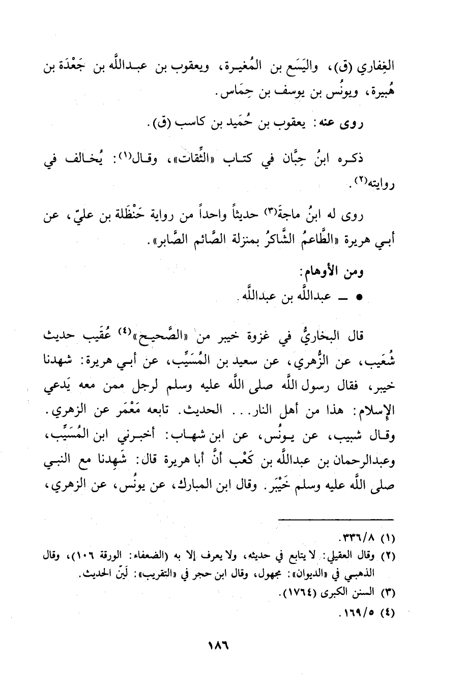 قال البخاري فِي غزوة خيبر من"الصحيح" (4) عقيب حديث شعيب، عَنِ الزُّهْرِيّ، عَنْ سَعِيد بْنِ المُسَيَّب، عَن أَبِي هُرَيْرة: شَهِدْنَا خَيْبَرَ، فَقَالَ رَسُولُ اللَّهِ صلى الله عليه وسلم لِرَجُلٍ مِمَّنْ مَعَهُ يَدَّعِي الإِسْلامَ: هَذَا مِنْ أَهْلِ النَّارِ ... الْحَدِيثَ. تَابَعَهُ مَعْمَرٌ عَنِ الزُّهْرِيّ. وَقَال شَبِيبٌ، عَنْ يُونُسَ، عَنِ ابْنِ شِهَابٍ: أَخْبَرَنِي ابْنُ المُسَيَّب، وعبْدُ الرَّحْمَنِ بْن عَبد اللَّهِ بْن كَعْبٍ أَنَّ أَبَا هُرَيْرة قال: شَهِدْنَا مَعِ النَّبِيِّ صَلَّى اللَّهُ عَلَيْهِ وسَلَّمَ خَيْبَرَ. وَقَال ابْنُ المبارك، عن يونس، عن الزُّهْرِيّ،