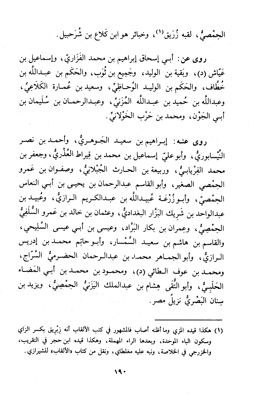 (1) هكذا قيده المزي وما أظنه أصاب فالمشهور في كتب الالقاب أنه زبريق بكسر الزاي وسكون الباء الموحدة، وبعدها الراء المهملة، وهكذا قيده ابن حجر في التقريب، والخزرجي في الخلاصة، ونبه عليه مغلطاي، ونقل من كتاب"الالقاب"للشيرازي.