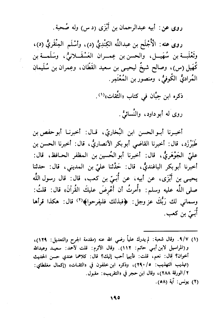 أَخْبَرَنَا أَبُو الحسن بْن البخاري، قال: أَخْبَرَنَا أبو حفص بن طَبَرْزَذَ، قال: أخبرنا الْقَاضِي أَبُو بَكْرٍ الأَنْصارِيّ، قال: أخبرنا الحسن بْن علي الجوهري، قال: أَخْبَرَنَا أبو الْحُسَيْنِ بْنُ الْمُظَفَّرِ الْحَافِظُ، قال: أَخْبَرَنَا أَبُو بَكْر الْبَاغَنْدِيُّ، قال: حَدَّثَنَا علي بْن المديني، قال: حَدَّثَنَا يَحْيَى بْنُ سَعِيد قال: أخبرنا أجلح قال: حَدَّثَنَا عَبد اللَّهِ بْن عَبد الرَّحْمَنِ بْنِ أَبْزَى، عَن أَبِيهِ، عَن أُبَيِّ بْنِ كَعْبٍ، قال: قال رَسُولُ اللَّهِ صلى اللَّهُ عَلَيْهِ وسَلَّمَ: أُمِرْتُ أَنْ أَعْرِضَ عَلَيْكَ الْقُرْآنَ"قال: قُلْتُ: وسماني لك ربك عزوجل: {فبذلك فلتفرحوا) {2) قال: هَكَذَا قَرَأَهَا أُبَيُّ بْنُ كعب.